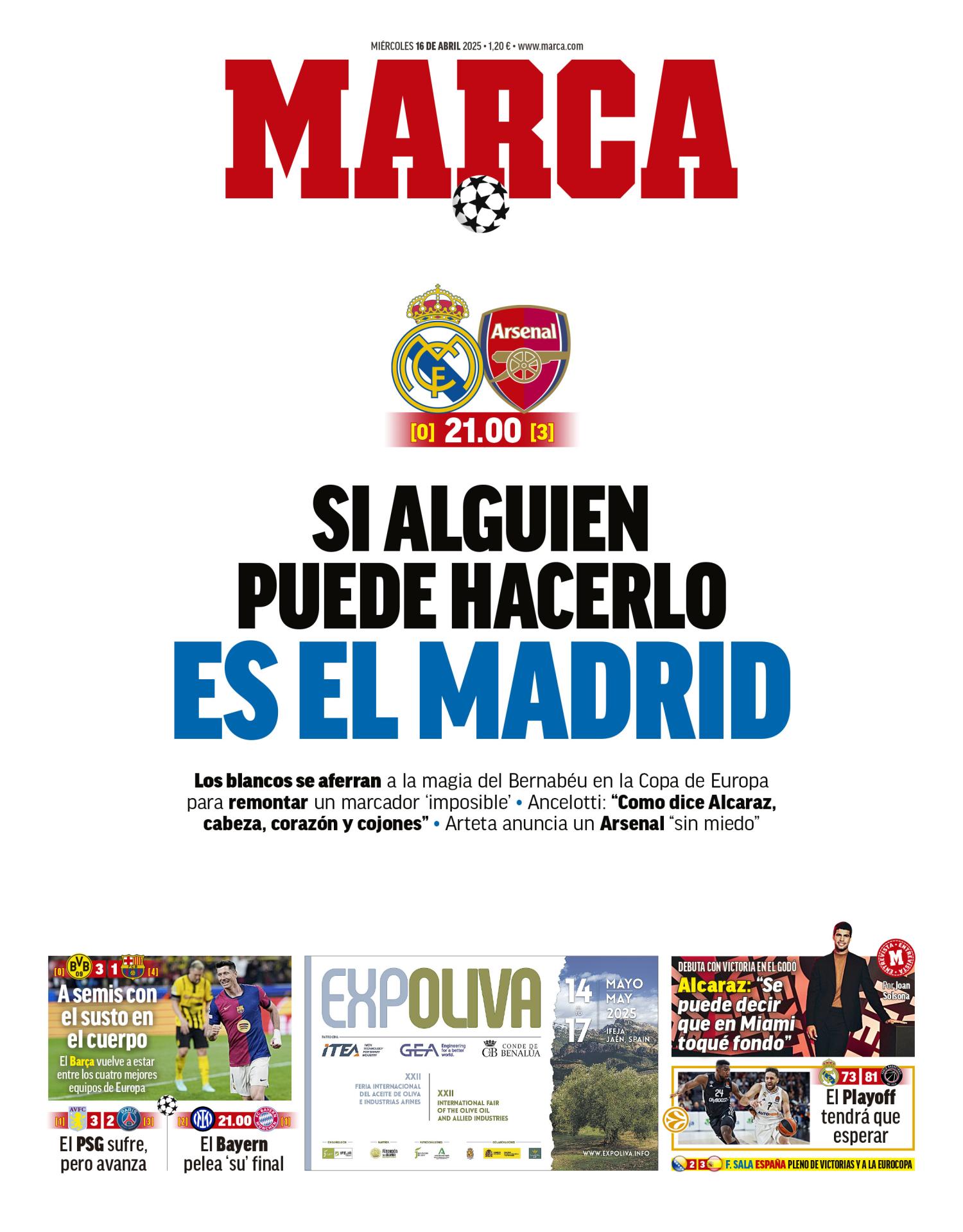 Este miércoles 16 de abril de 2025, el diario Marca saca en portada el Real Madrid - Arsenal y titula: "Si alguien puede hacerlo, es el Madrid".