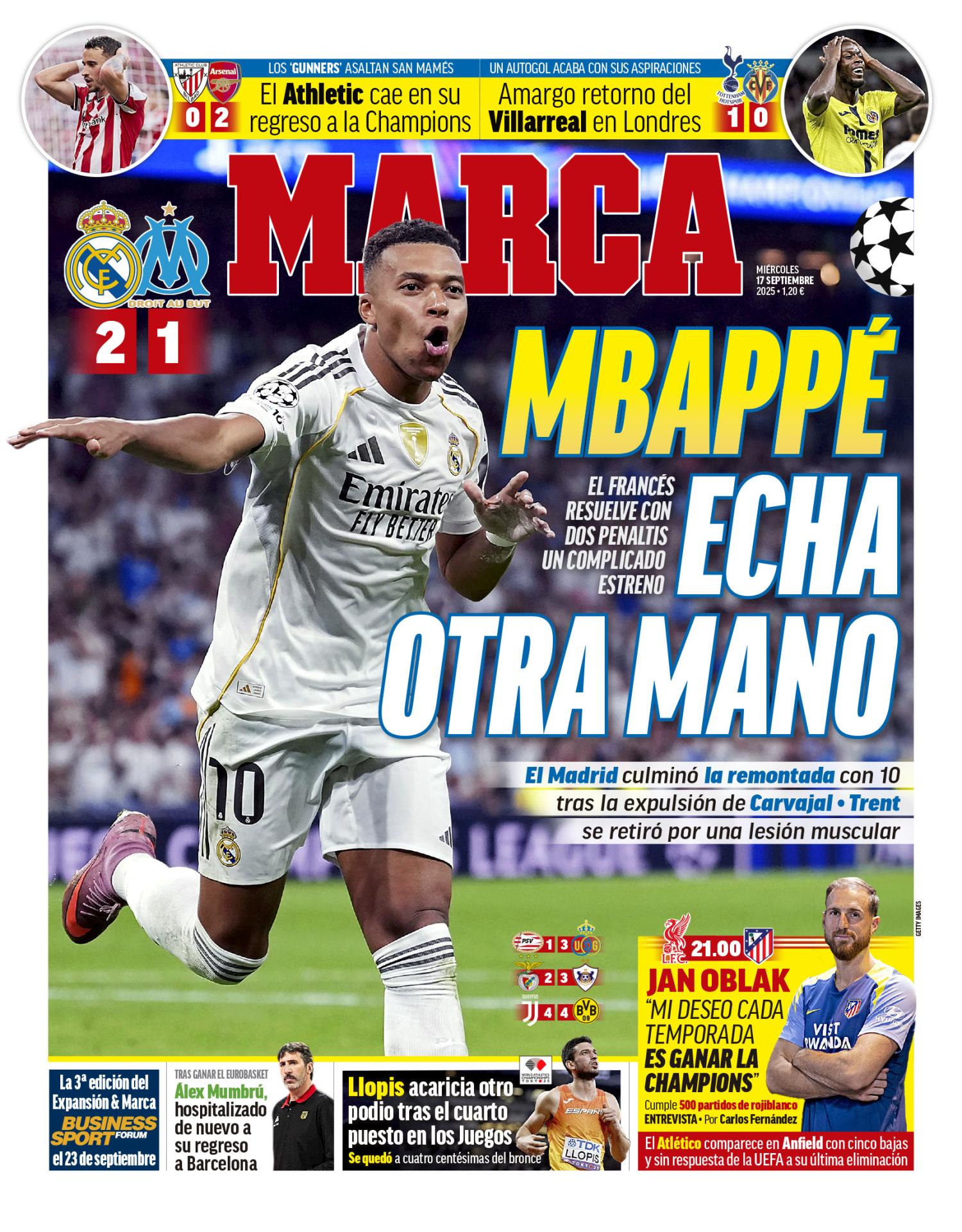 Este miércoles 17 de septiembre, el diario Marca destaca en su portada el doblete de Kylian Mbappé en Champions para dar la victoria al Real Madrid ante el Olympique de Marsella.