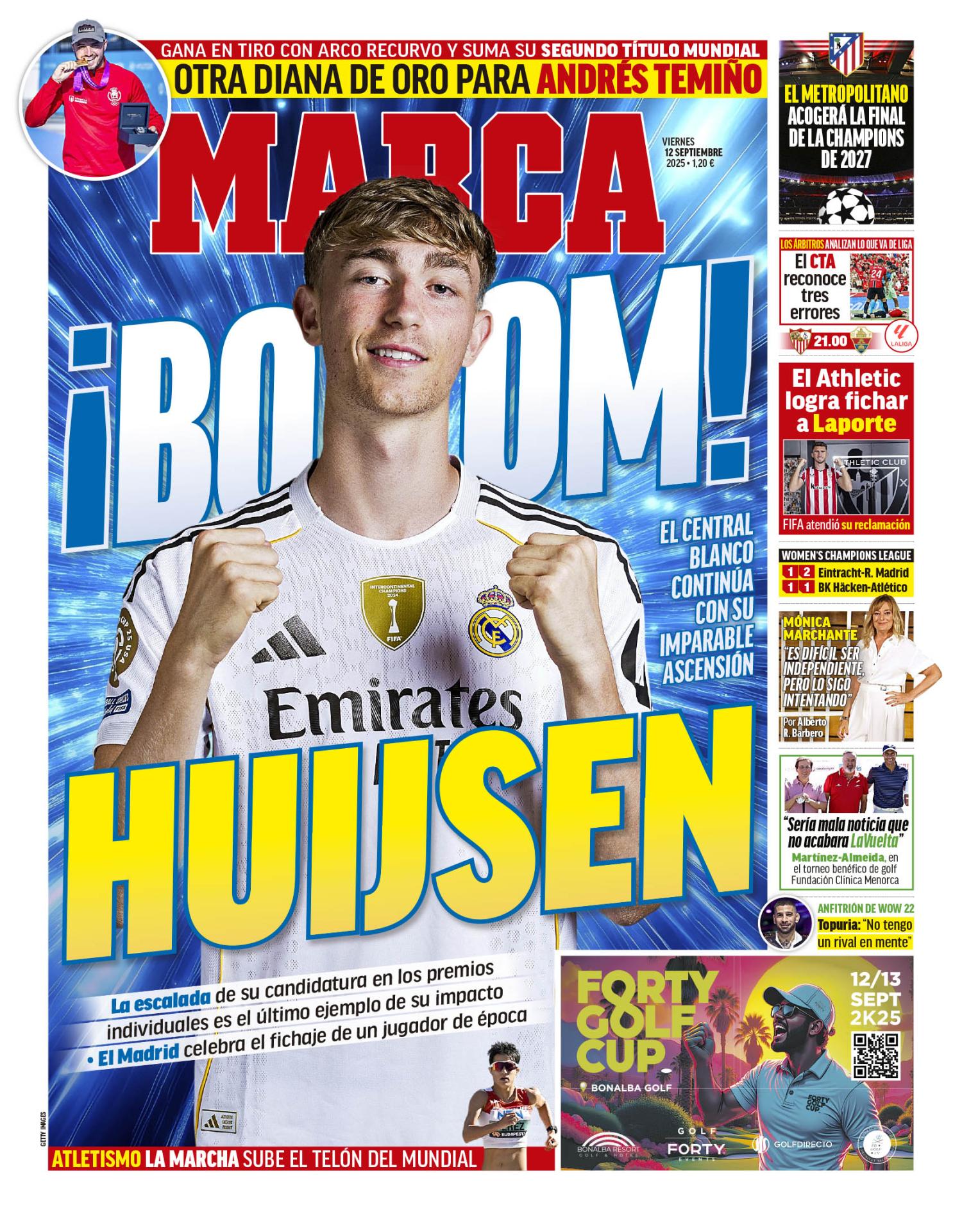 El diario Marca, en su portada para este viernes 12 de septiembre de 2025, destaca la imparable ascensión de Huijsen en el Real Madrid.