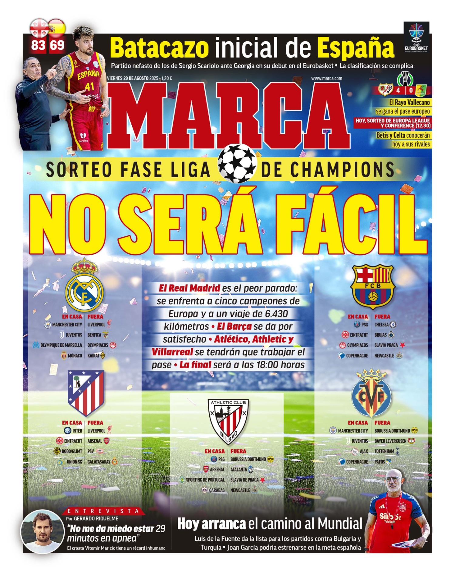 El diario Marca, en su portada para este viernes 29 de agosto de 2025, destaca los emparejamientos derivados del sorteo de la Champions League 2025-26. "No será fácil" señala.