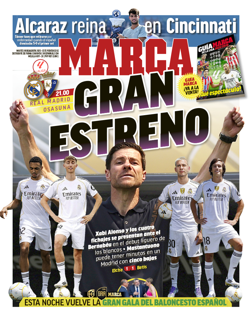 El diario Marca, en su portada para este martes 19 de agosto de 2025, destaca en su portada el "gran estreno" de Xabi Alonso y de los cuatros fichajes del Real Madrid (Huijsen, Alexander-Arnold, Carreras y Mastantuono) en el Santiago Bernabéu.