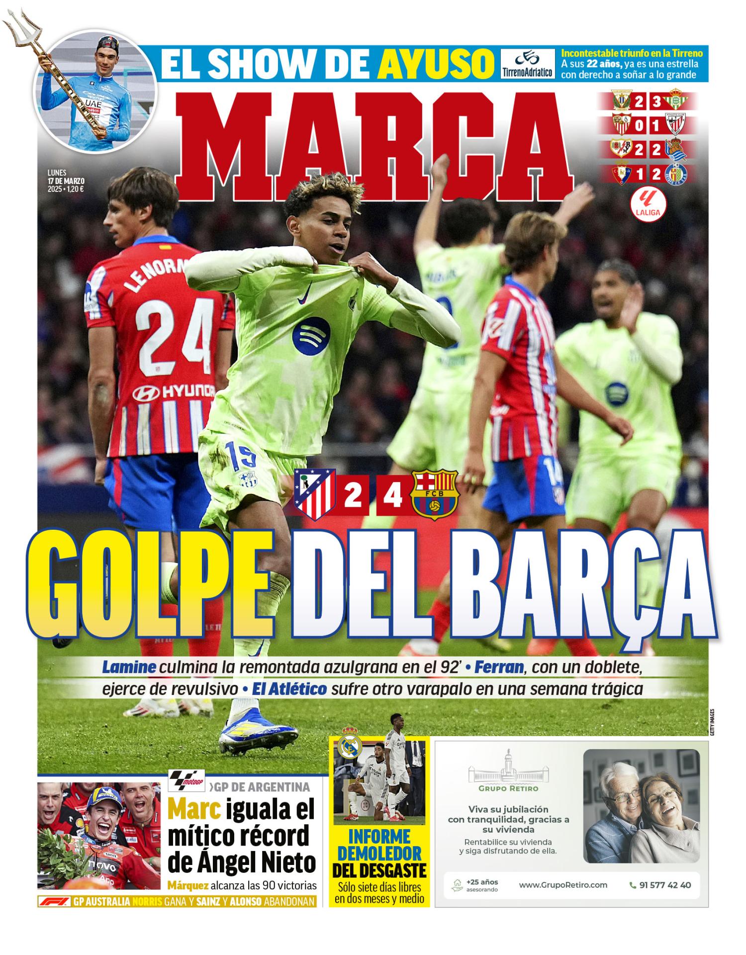 El diario Marca, en su portada para este lunes 17 de marzo de 2025, destaca la victoria del Barcelona ante el Atlético y el "informe demoledor del desgaste" de un Real Madrid que solo tiene "siete días libres en dos meses y medio".