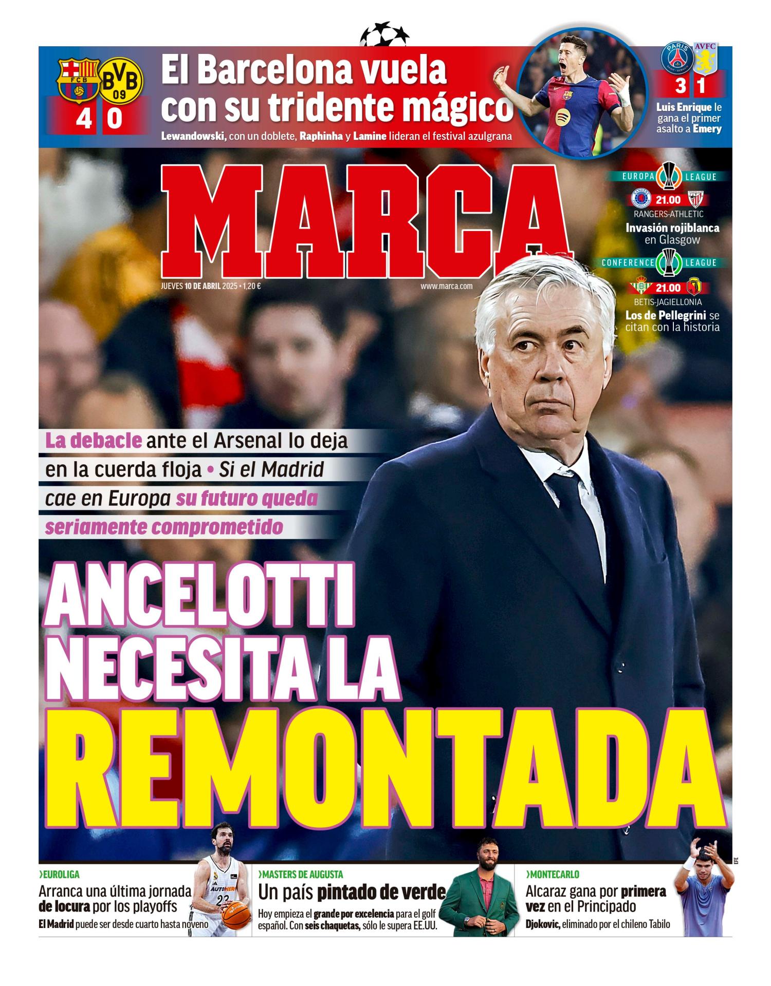 En su edición de este jueves, la portada del diario Marca viene protagonizada por Carlo Ancelotti y su futuro "comprometido". En caso de quedar eliminado la próxima semana a manos del Arsenal, su continuidad en el Real Madrid estará en peligro.