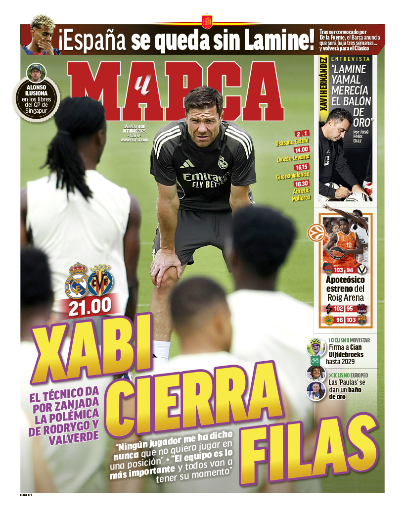 Para este sábado 4 de octubre, el diario Marca destaca en su portada el cierre de filas de Xabi Alonso con las polémicas surgidas en los últimos días con Fede Valverde y Rodrygo Goes acerca de la posición donde quieren jugar.