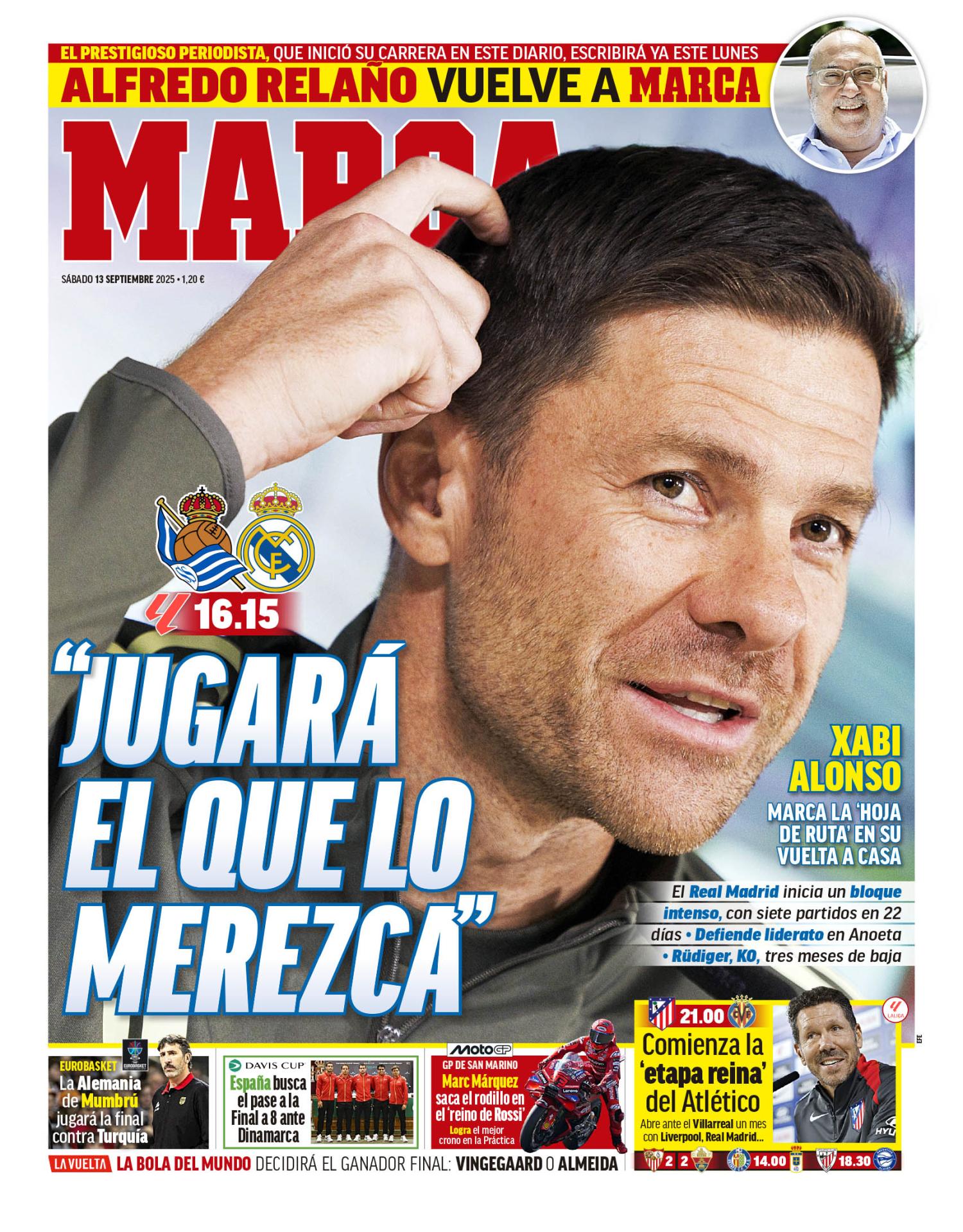 El diario Marca saca en primera plana de este sábado 13 de septiembre las últimas palabras de Xabi Alonso sobre el planteamiento que tiene el tolosarra en el Real Madrid: "Jugará el que lo merezca".