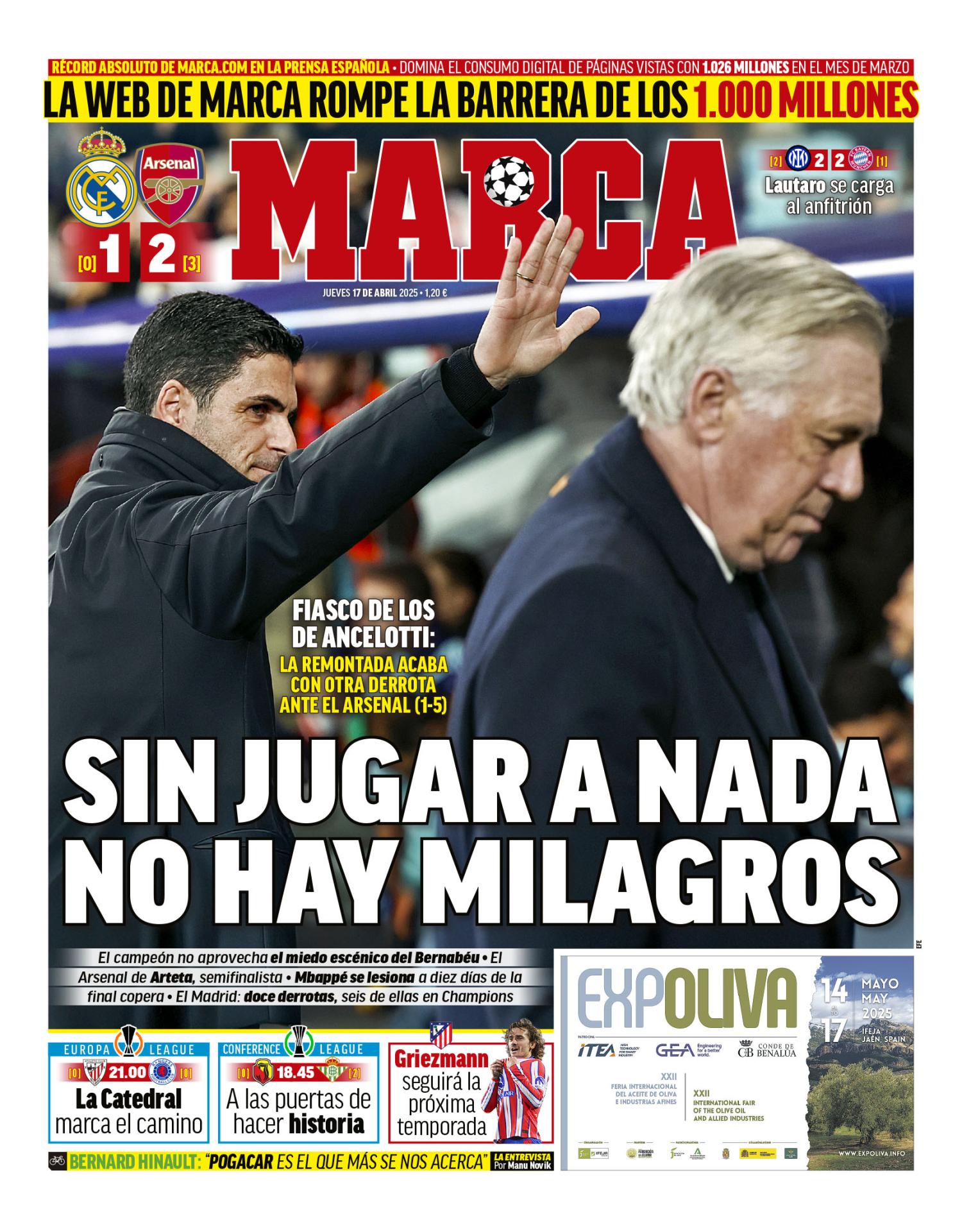 El diario Marca abre portada este jueves con el Real Madrid 1-2 Arsenal que significó anoche la eliminación del conjunto blanco en la máxima competición continental.