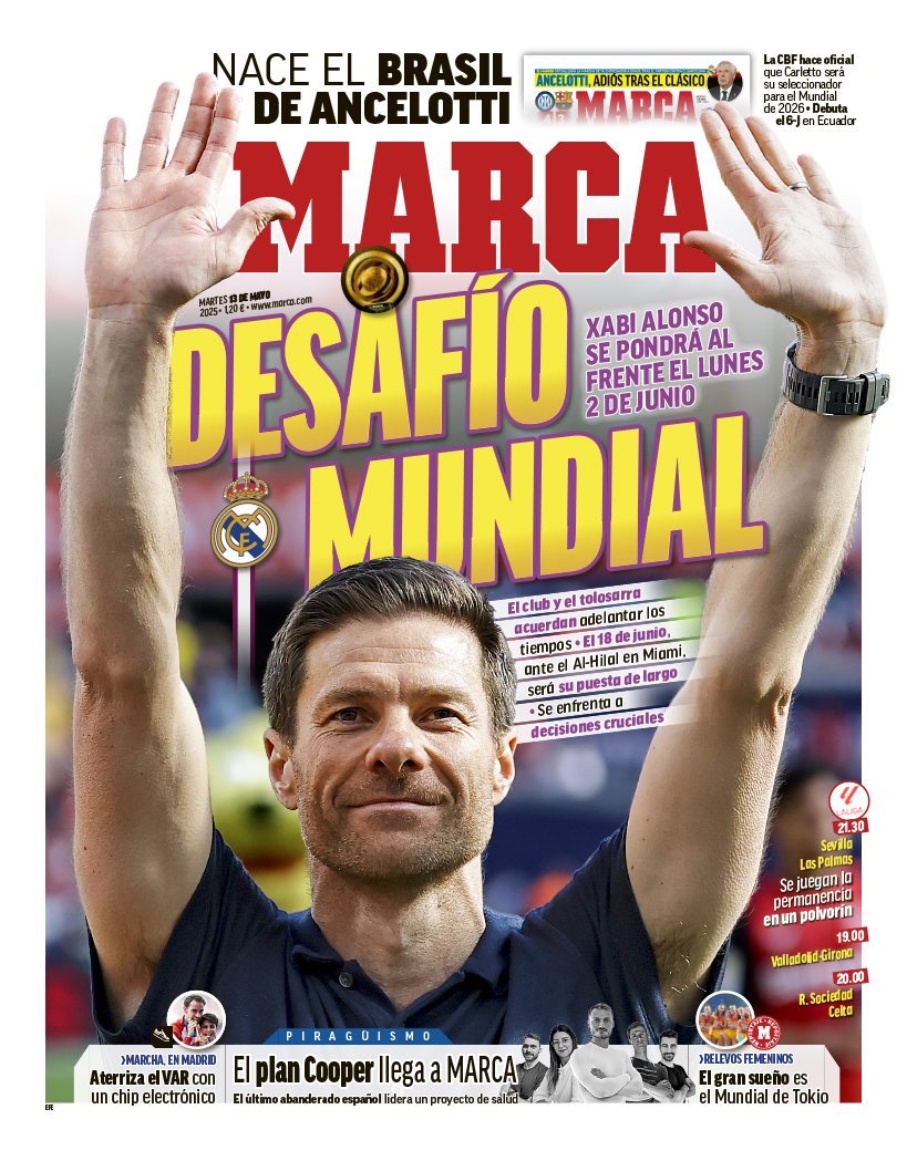 El diario Marca saca este martes 13 de mayo de 2025 en portada a un Xabi Alonso que se pondrá al frente del banquillo del Real Madrid a partir del próximo 2 de junio, es decir, el tolosarra dirigirá al conjunto blanco en el Mundial de Clubes.
