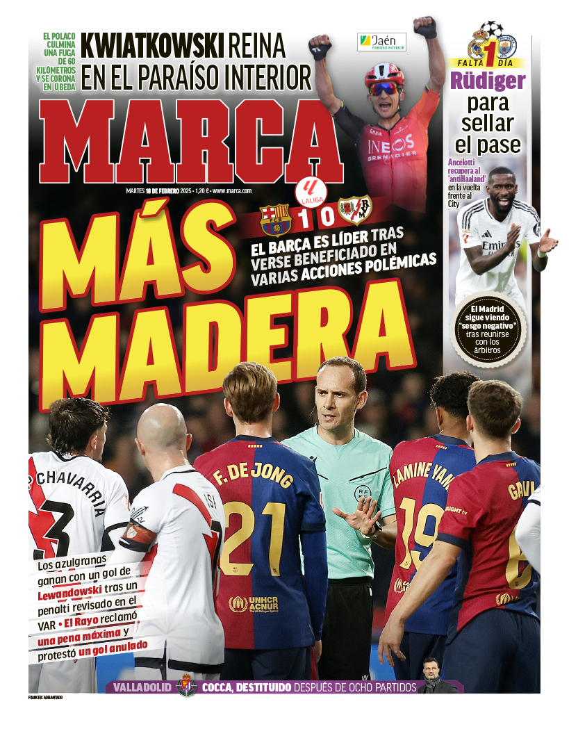 El diario Marca, en su portada para este martes 18 de febrero de 2025, destaca el Barcelona - Rayo Vallecano, que acabó 1-0 y que estuvo cargado de polémica arbitral. "Más madera" titula.