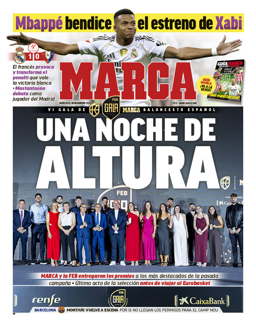 El diario Marca, además de la gala del baloncesto español, destaca en su portada para este miércoles 20 de agosto de 2025 la victoria del Real Madrid frente a Osasuna (1-0) con Mbappé como protagonista.
