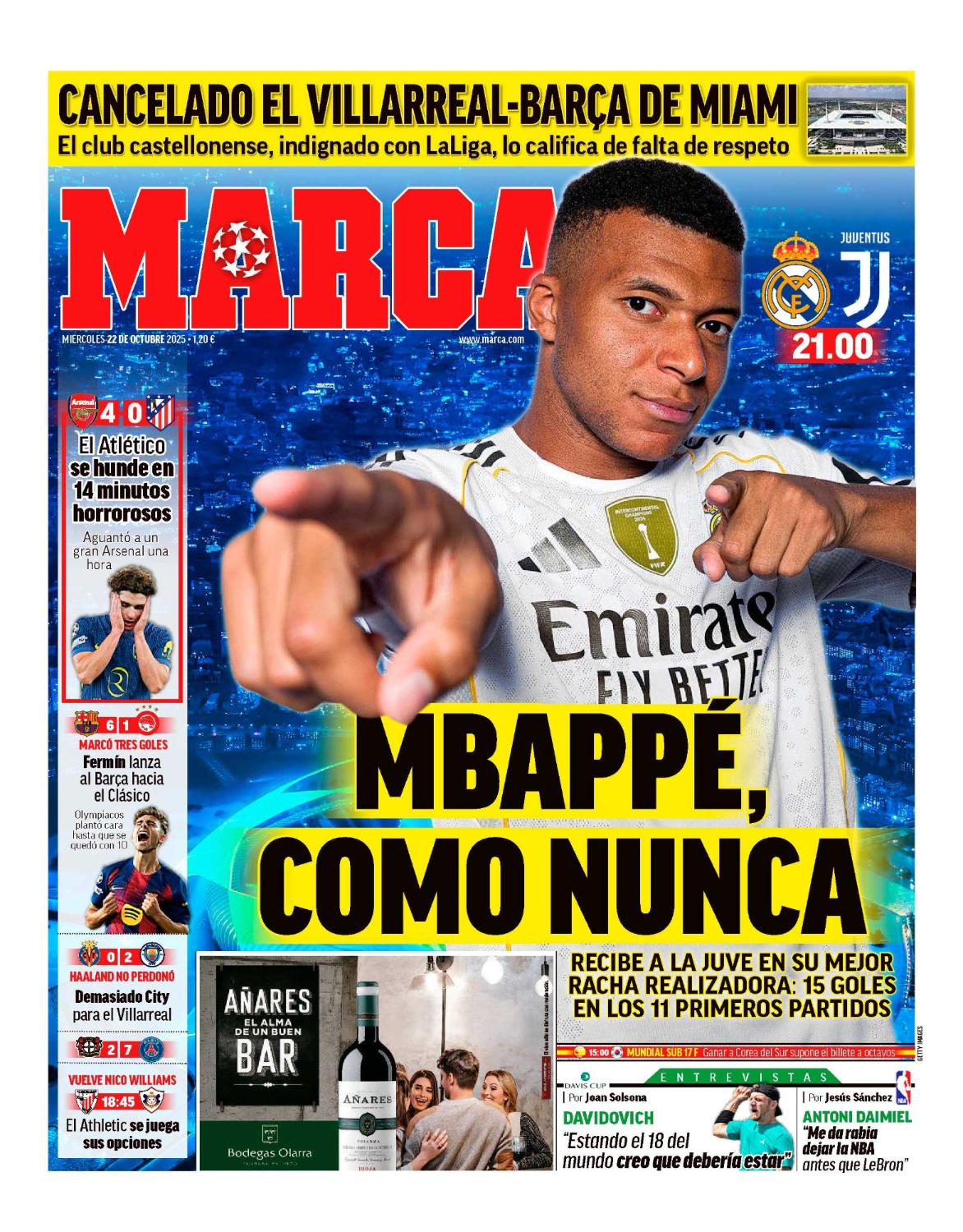 El diario Marca destaca en su portada del miércoles 22 de octubre a Kylian Mbappé y su gran estado de forma, ya que ha anotado quince goles en once partidos. También tiene protagonismo la cancelación del Villarreal - Barcelona que iba a tener lugar en Miami.