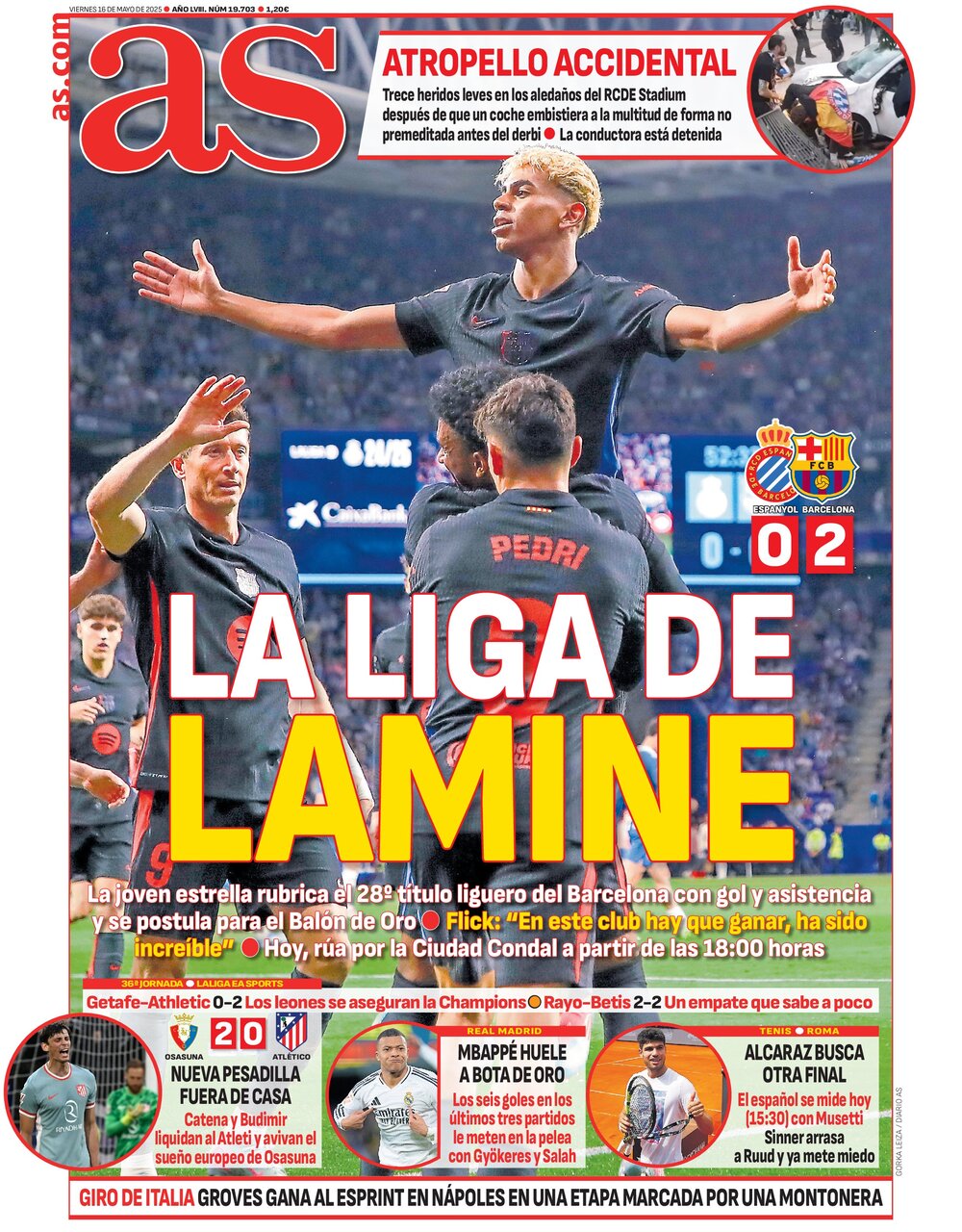 El diario as, en su portada para este viernes 16 de mayonde 2025, saca a Lamine Yamal, el héroe del derbi de Barcelona en el que el conjunto culé terminó de conquistar el título liguero. Además, destaca a un Kylian Mbappé que se ha metido de lleno en la lucha por la bota de oro.