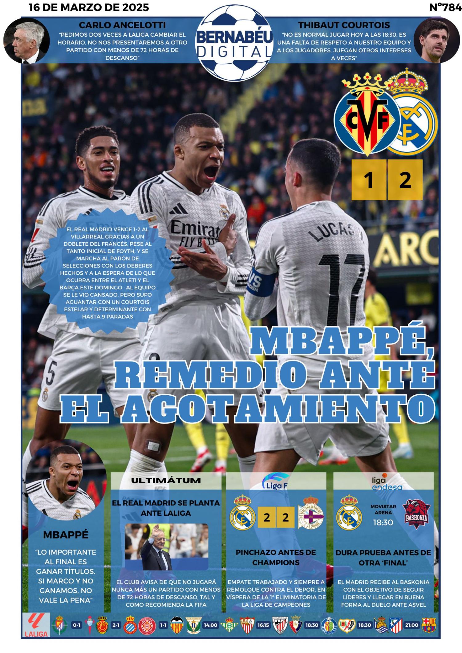 Bernabéu Digital destaca en su portada BD la victoria del Real Madrid por 1-2 al Villarreal, resaltando a Mbappé y toda la polémica del poco descanso que ha tenido el conjunto blanco. También se destacan las palabras de Ancelotti y Courtois.