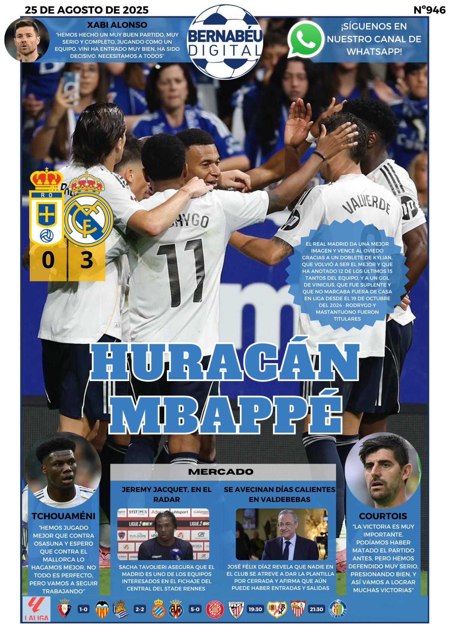 La victoria del Real Madrid ante el Oviedo, con Kylian Mbappé como gran protagonista, copa las portadas de este lunes 25 de agosto de 2025.