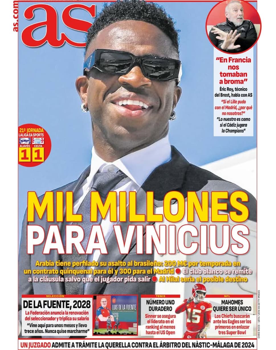 El diario As destaca en su portada la última oferta de Arabia Saudí para hacerse con Vinicius Jr con vistas a la próxima temporada.