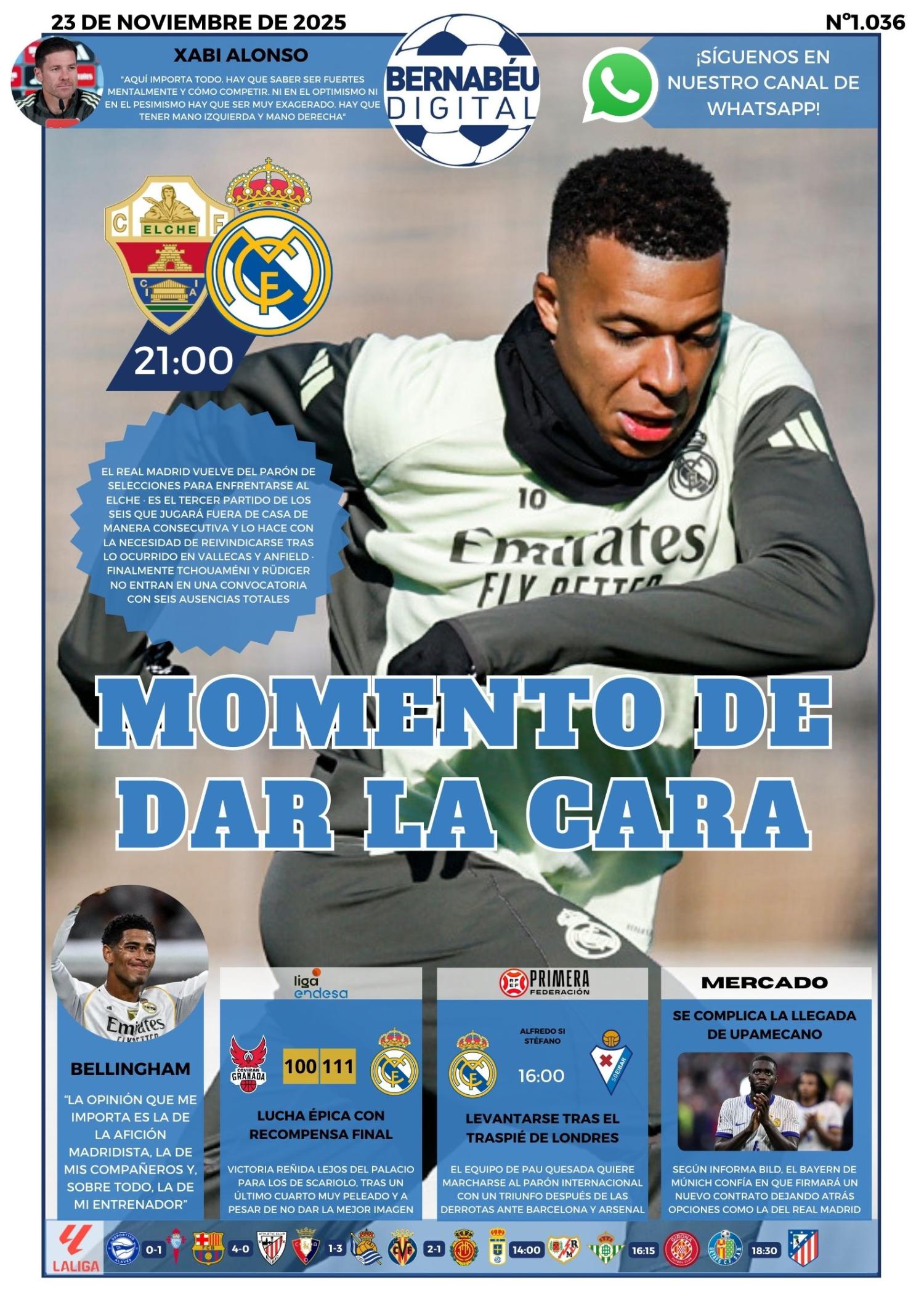 Bernabéu Digital destaca en su portada la previa del Elche - Real Madrid, con las declaraciones de Xabi Alonso en rueda de prensa. Además, también se hace hincapié en la victoria del equipo de Baloncesto.