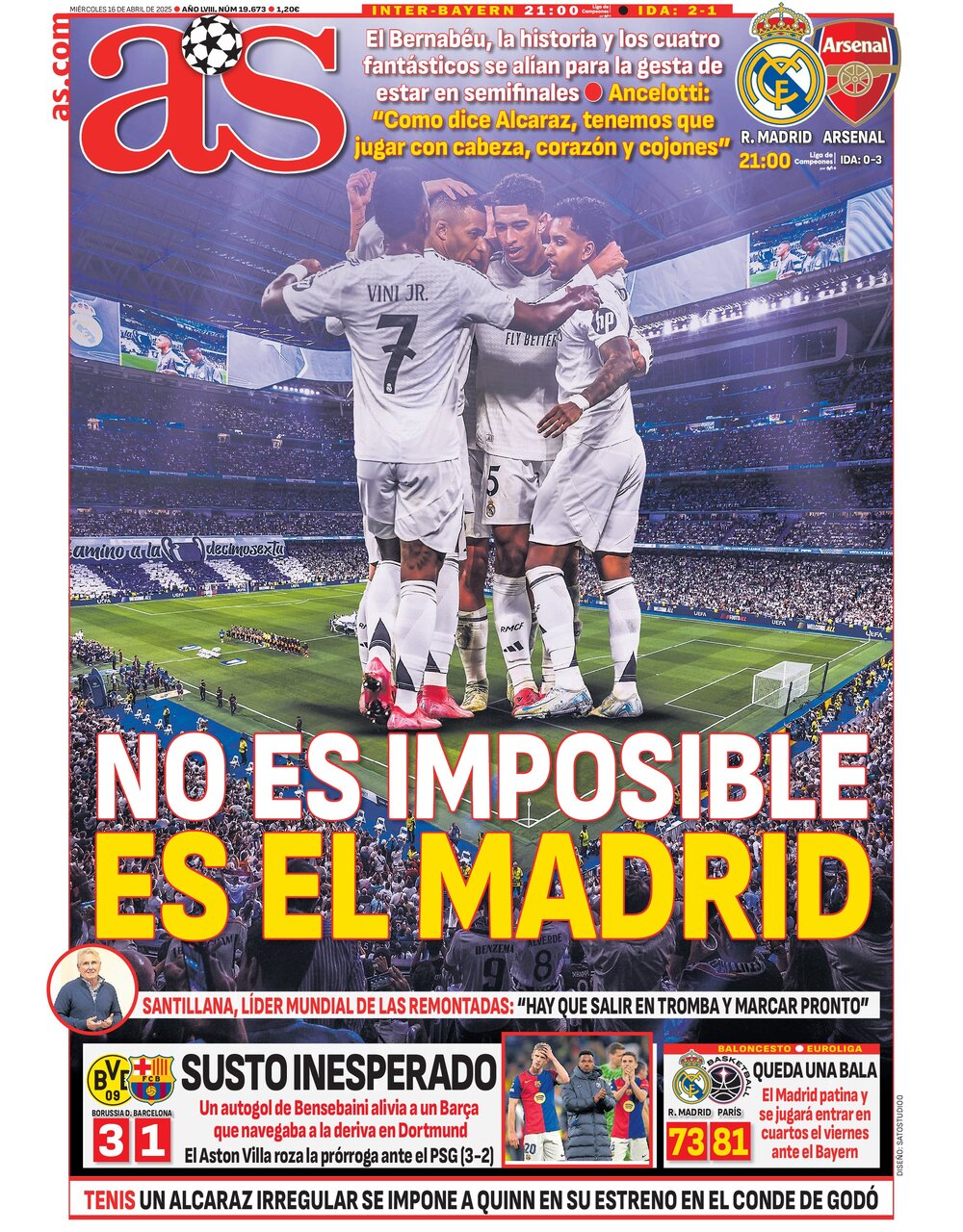 El diario as, en su portada para este miércoles 16 de abril de 2025, destaca el Real Madrid - Arsenal y titula: "No es imposible, es el Madrid".