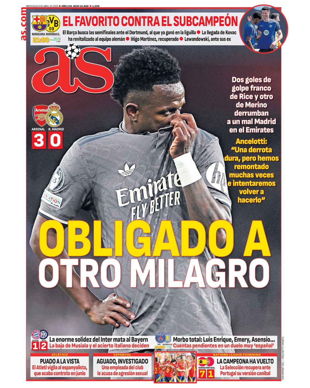 En su portada para este miércoles 9 de abril de 2025, el diario as destaca la dura derrota ante del Real Madrid el Arsenal (3-0) en Champions League. "Obligados a otro milagro", titula.