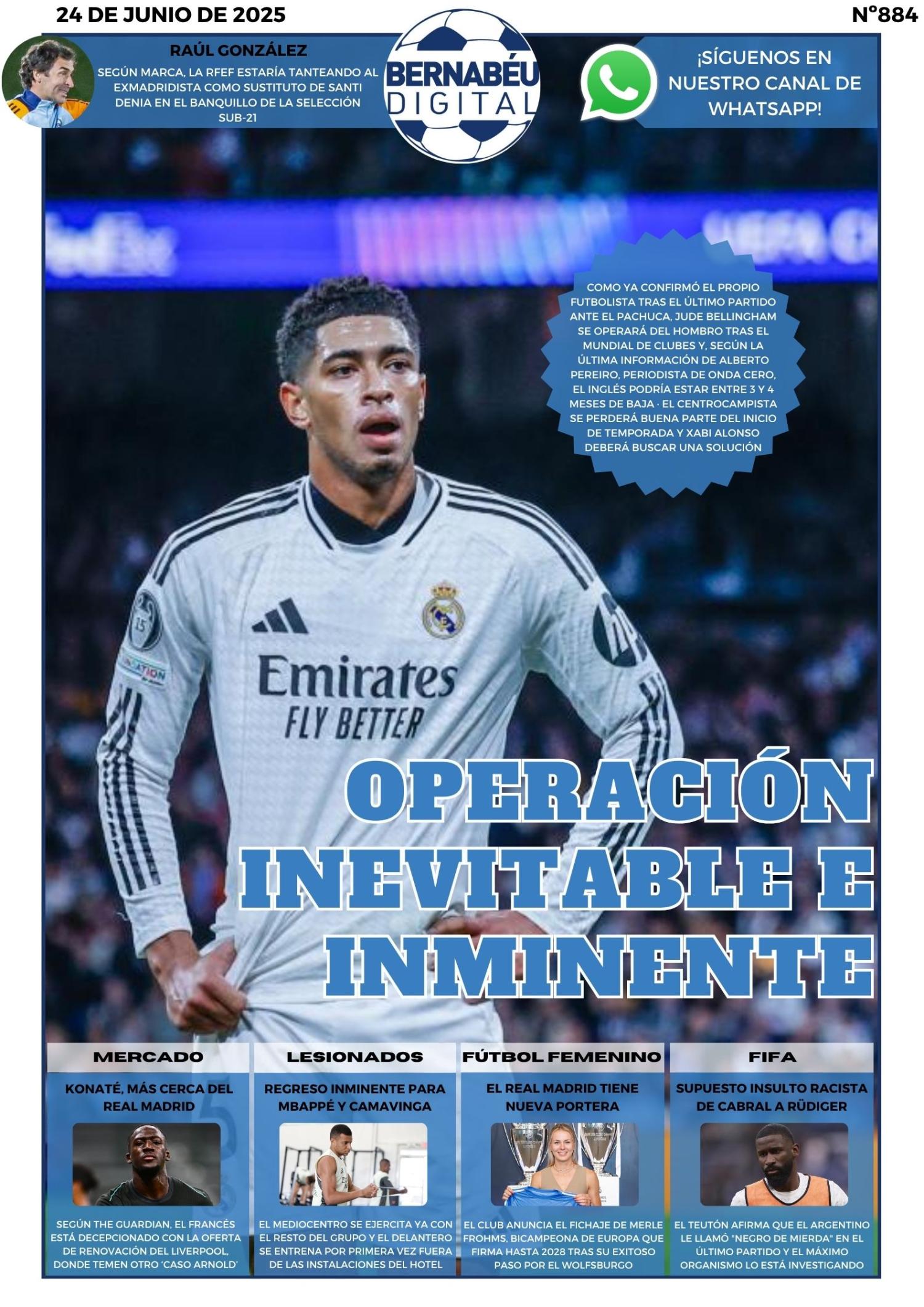 En la portada BD de este martes destacamos la operación de Bellingham que le podría dejar sin jugar durante tres o cuatro meses. Además, hacemos referencia al posible fichaje de Konaté, el interés de España en Raúl, el fichaje de Merle Frohms, la reaparición de Mbappé y Camavinga y el supuesto insulto racista a Rüdiger.