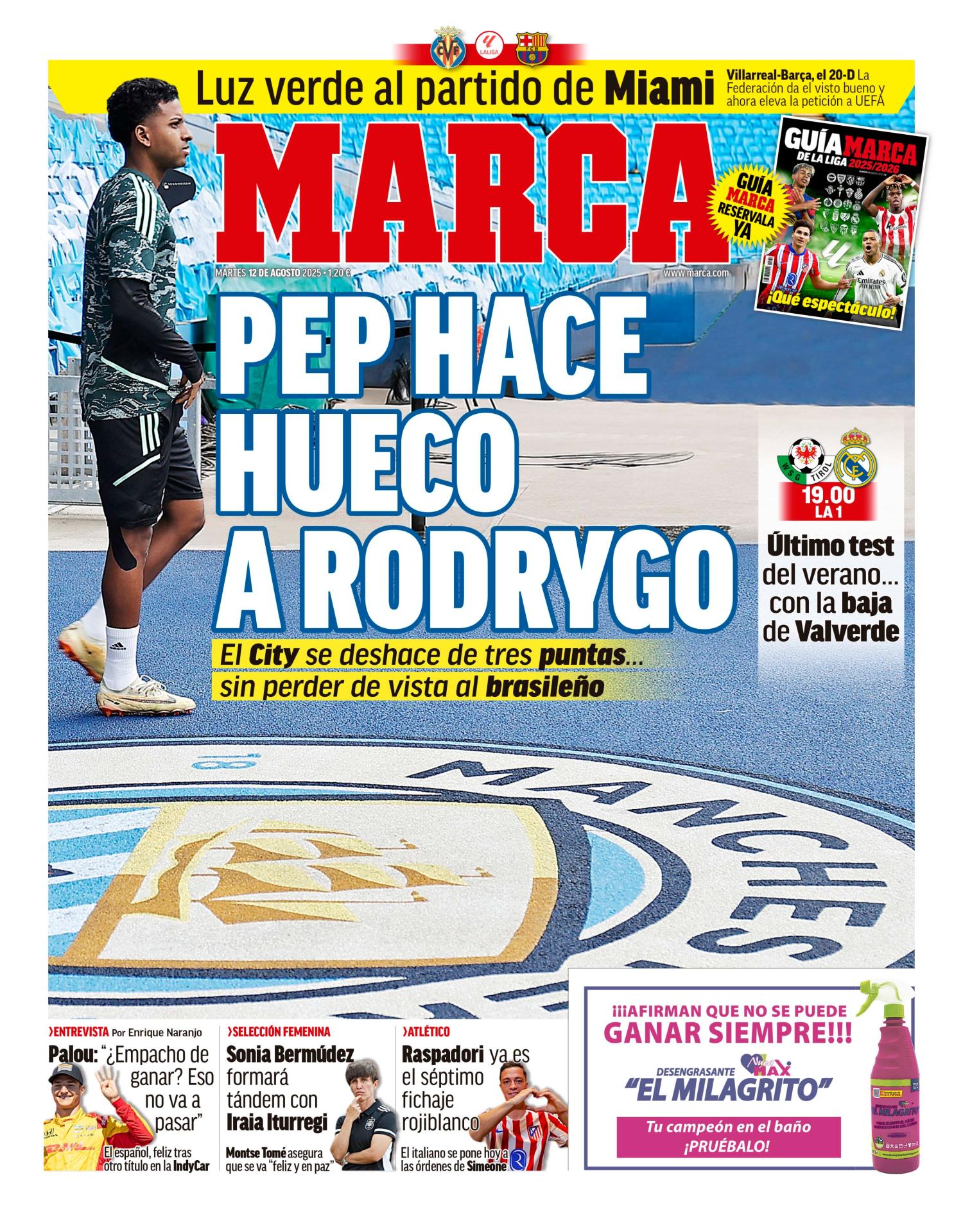 El diario Marca destaca en su primera plana la previa del partido amistoso entre el WSG Tirol y el Real Madrid que se jugará esta misma tarde en el Tivoli Stadion. También hace referencia al interés del Manchester City en Rodrygo.