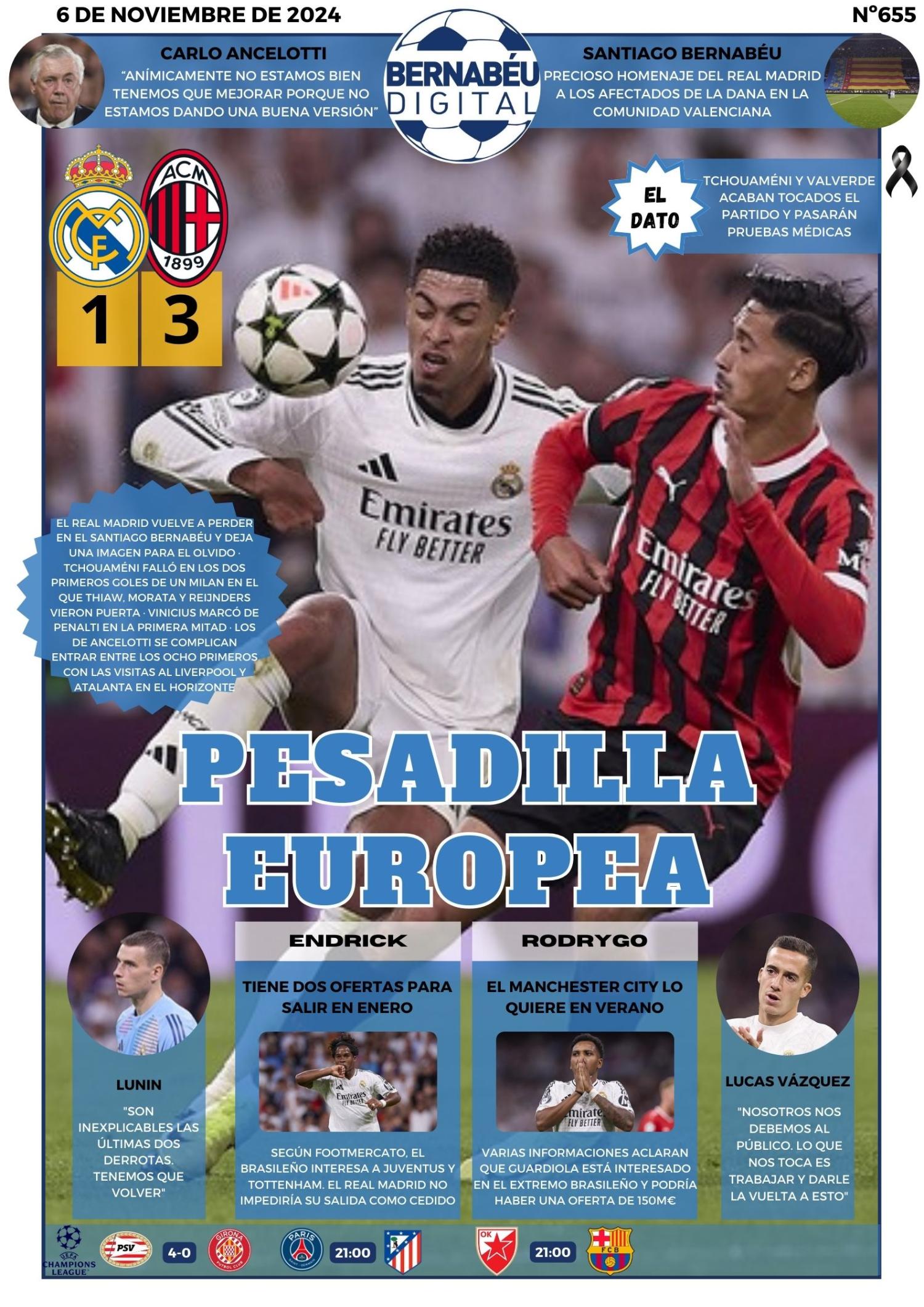 En nuestra portada del 6 de noviembre de 2024, abrimos en Bernabéu Digital con la nueva derrota del Real Madrid contra el AC Milan en el Santiago Bernabéu. Los madridistas caen de nuevo contra un buen conjunto italiano, que anotó tres goles gracias al acierto de Thiaw, Álvaro Morata y Reijnders.
