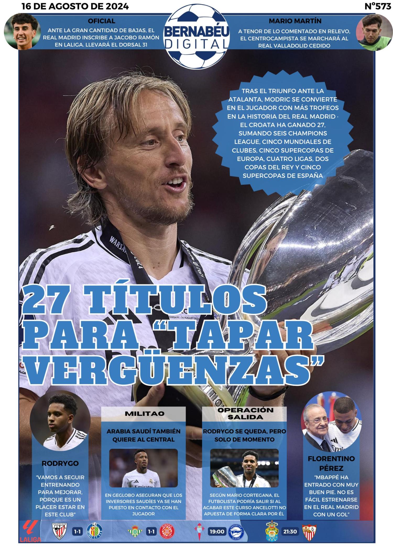 La portada de hoy de Bernabéu Digital con el récord de títulos de Luka Modric con el Real Madrid. También destacamos las palabras de Florentino Pérez y Rodrygo, el futuro del delantero brasileño y de Éder Militao, además de la ficha en LaLiga de Jacobo Ramón y la salida de Mario Martín.