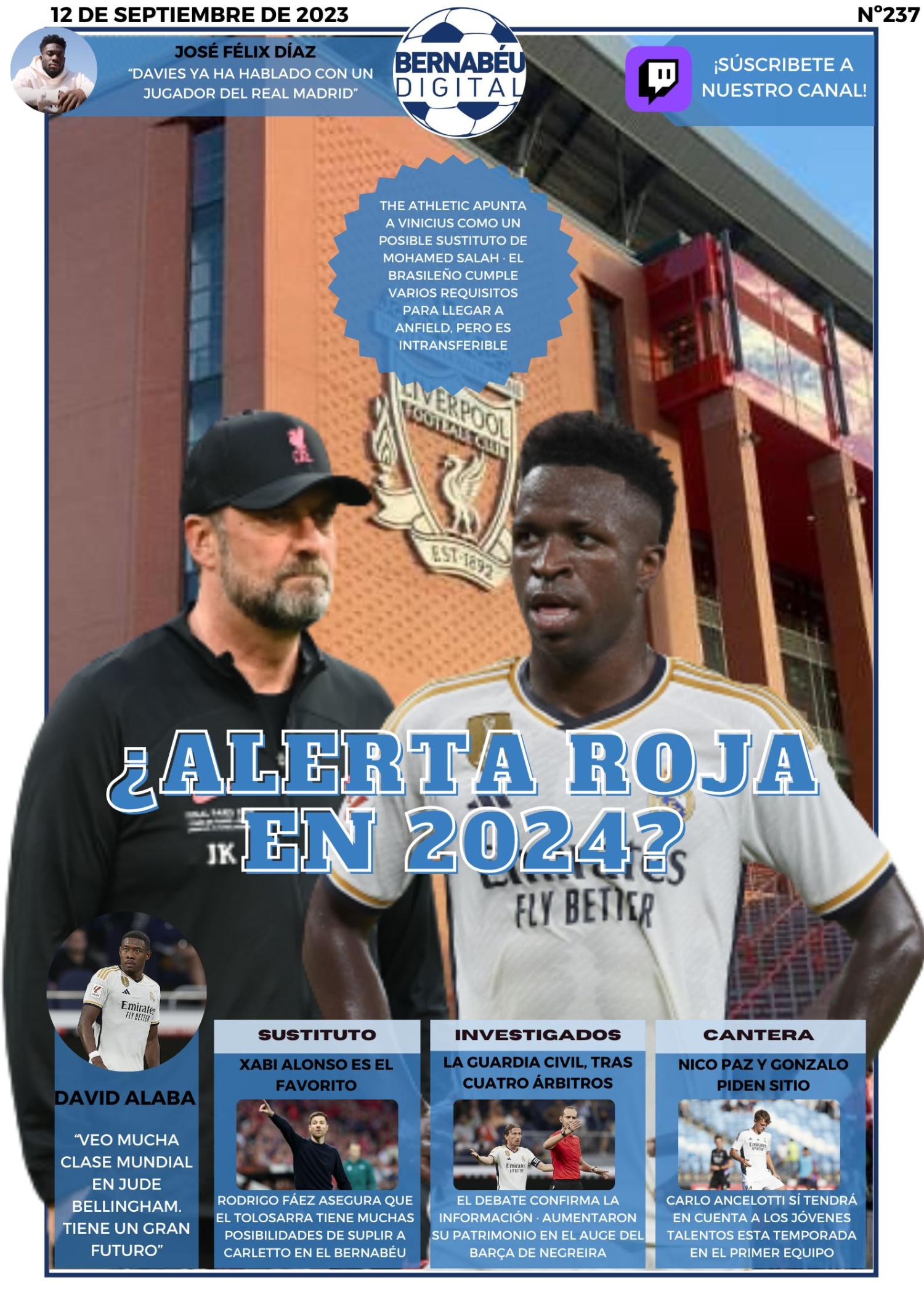 En nuestra portada del martes 12 de septiembre, en Bernabéu Digital con la noticia desvelada por The Athletic sobre el interés del Liverpool en Vinicius para sustituir la posible salida de Salah el año que viene. Asimismo, destacamos lo último sobre el futuro de Alphonso Davies y un hipotético fichaje por el Real Madrid.