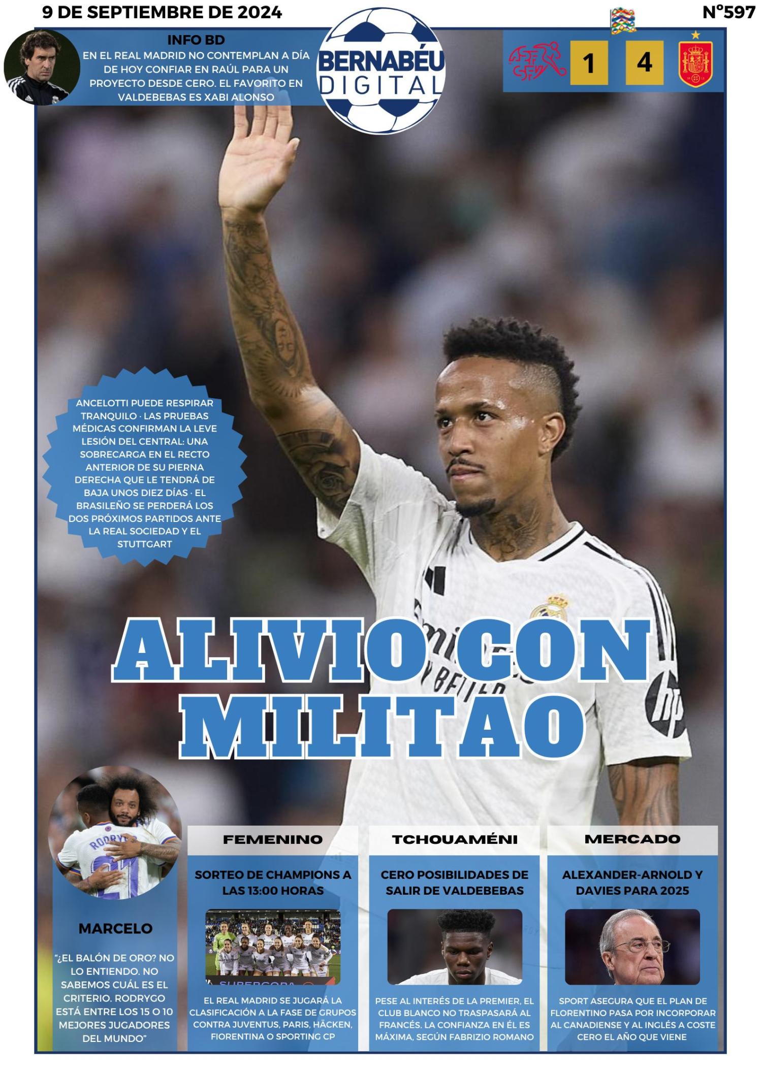 En nuestra portada del lunes 9 de septiembre de 2024, en Bernabéu Digital hemos decidido abrir con el parte médico de Eder Militao, que estará de baja alrededor de diez días. Asimismo, destacamos la confianza del Real Madrid en Tchouaméni, el sorteo de la Champions League Femenina, las declaraciones de Marcelo, nuestra INFO BD sobre Raúl y el interés madridista en Alexander-Arnold y Davies para 2025.