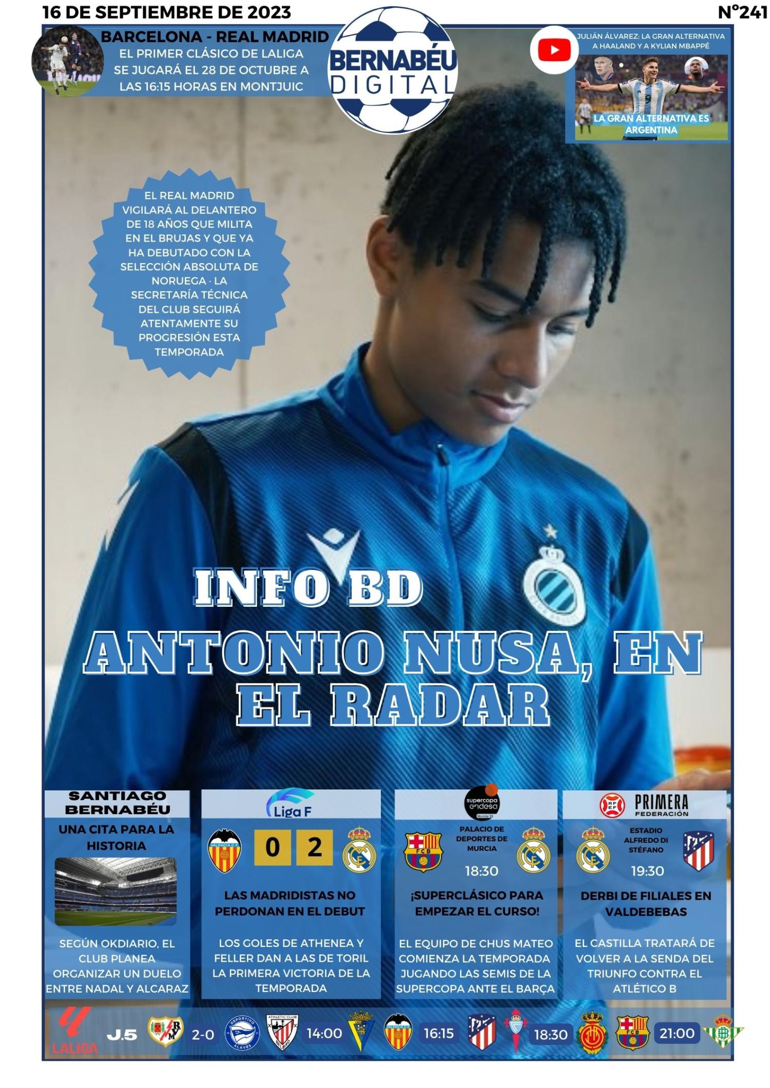 Para este sábado 16 de septiembre, en Bernabéu Digital destacamos en portada nuestra última información sobre el interés del Real Madrid en Antonio Nusa, la nueva joya noruega del Brujas. Asimismo, resaltamos los próximos partidos del Castilla y del equipo de baloncesto, la victoria de las chicas ante el Valencia, el horario del primer clásico de la temporada y el gran evento que prepara el club para el nuevo Bernabéu.