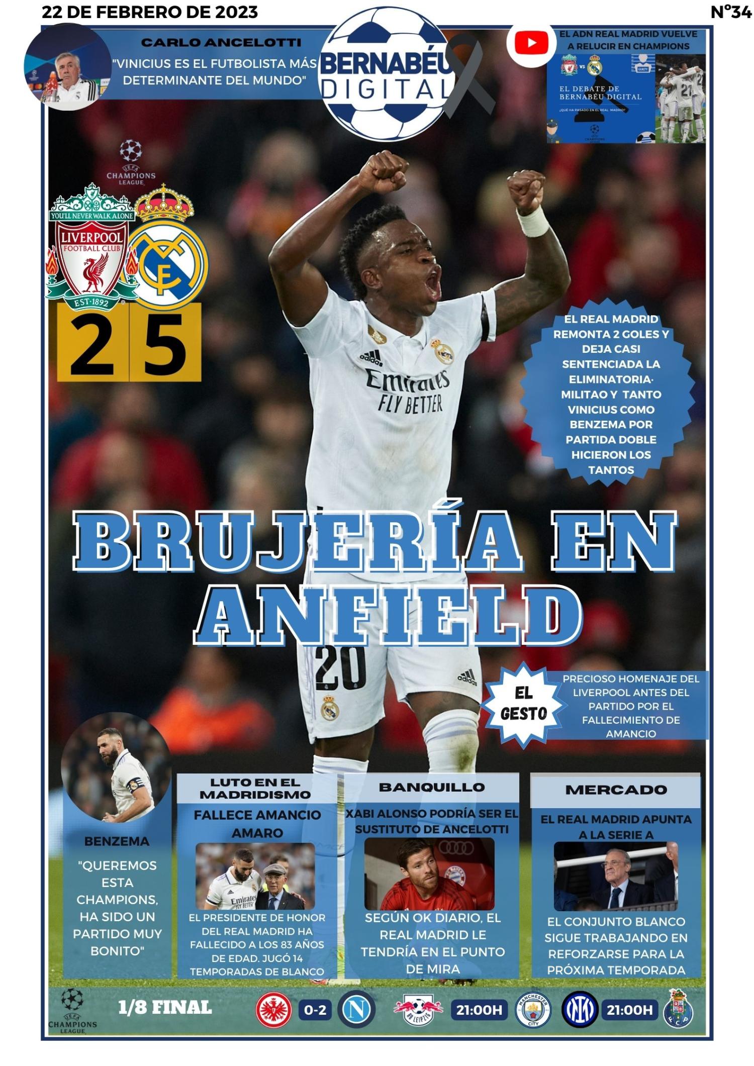 En la portada de este miércoles, desde Bernabéu Digital hemos querido destacar la victoria del Real Madrid en Anfield por 2-5 contra el Liverpool. También hacemos referencia al fallecimiento de Amancio Amaro, presidente de honor del conjunto blanco. Además, destacamos la posibilidad de que Xabi Alonso se convierta en entrenador madridista y en una nueva opción de mercado.