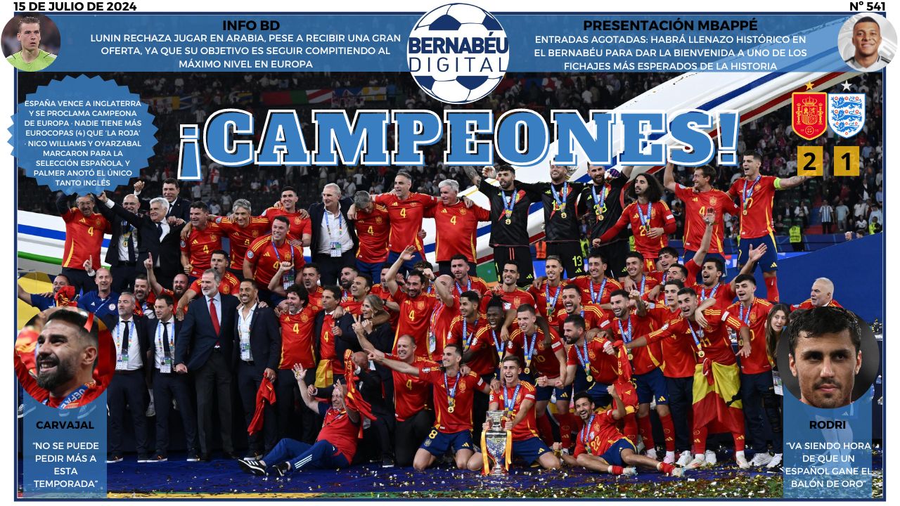 En nuestra portada de este lunes 15 de julio de 2024, en Bernabéu Digital hemos decidido abrir con la victoria de España en la final de la Eurocopa contra Inglaterra (2-1).