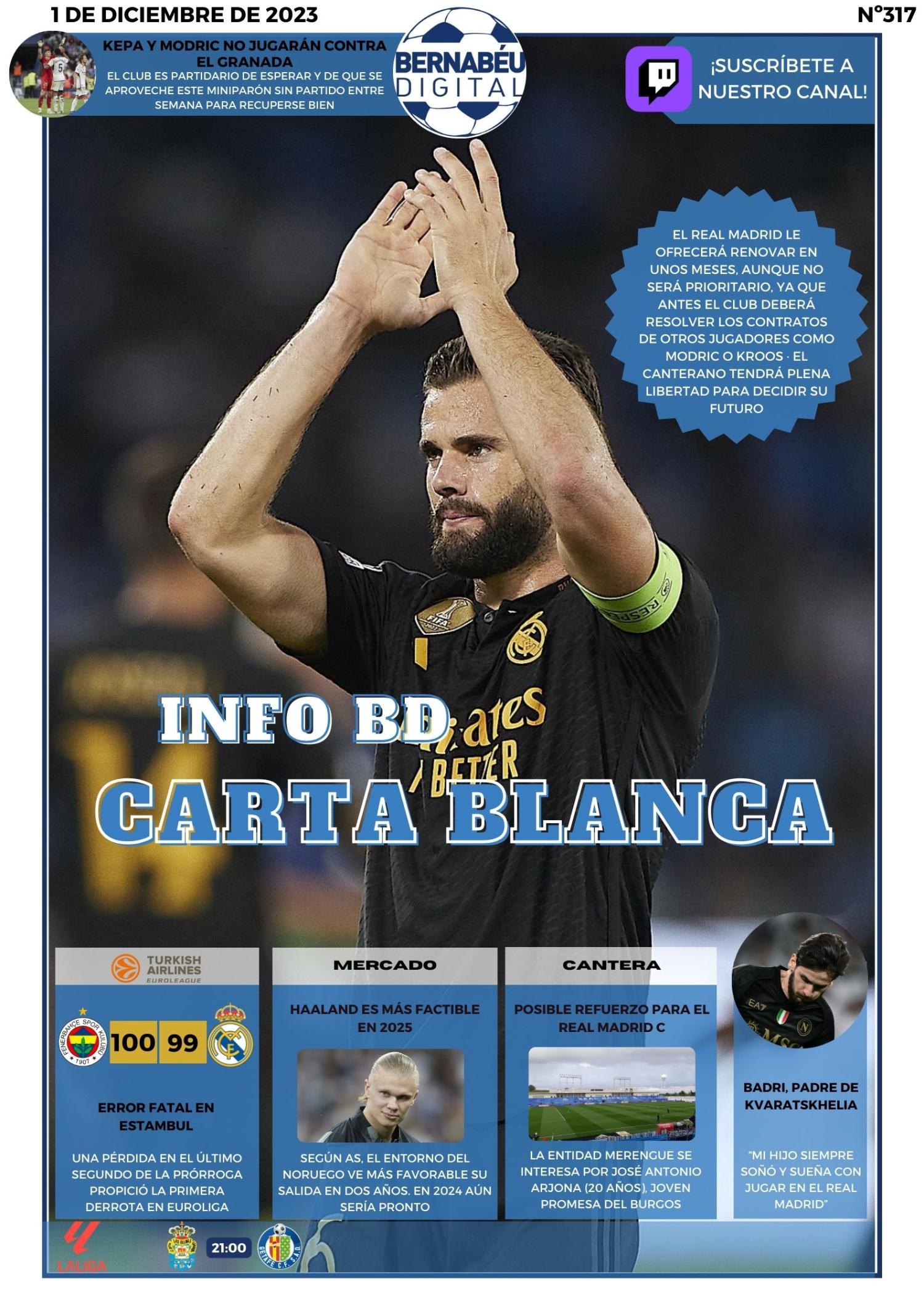 Este viernes 1 de diciembre, en Bernabéu Digital destacamos en portada nuestra última información en torno a la posible renovación de Nacho Fernández. Asimismo, resaltamos la derrota del Real Madrid de baloncesto en Estambul, las palabras del padre de Kvaratskhelia, las últimas novedades sobre Haaland, la situación de Kepa y Modric, y la nueva joya que tantea el club para el segundo filial.