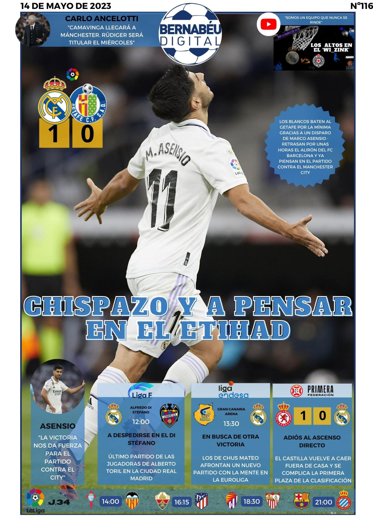 En nuestra portada para este 14 de mayo de 2023 destacamos la victoria del Real Madrid frente al Getafe, con un chispazo de Asensio que sirvió para hacerse con el triunfo y coger así confianza de cara al próximo duelo de Champions contra el Man City. Asimismo, en Bernabéu resaltamos las declaraciones de Ancelotti y Asensio, la derrota del Castilla y los partidos pendientes del equipo femenino y del conjunto de Chus Mateo.