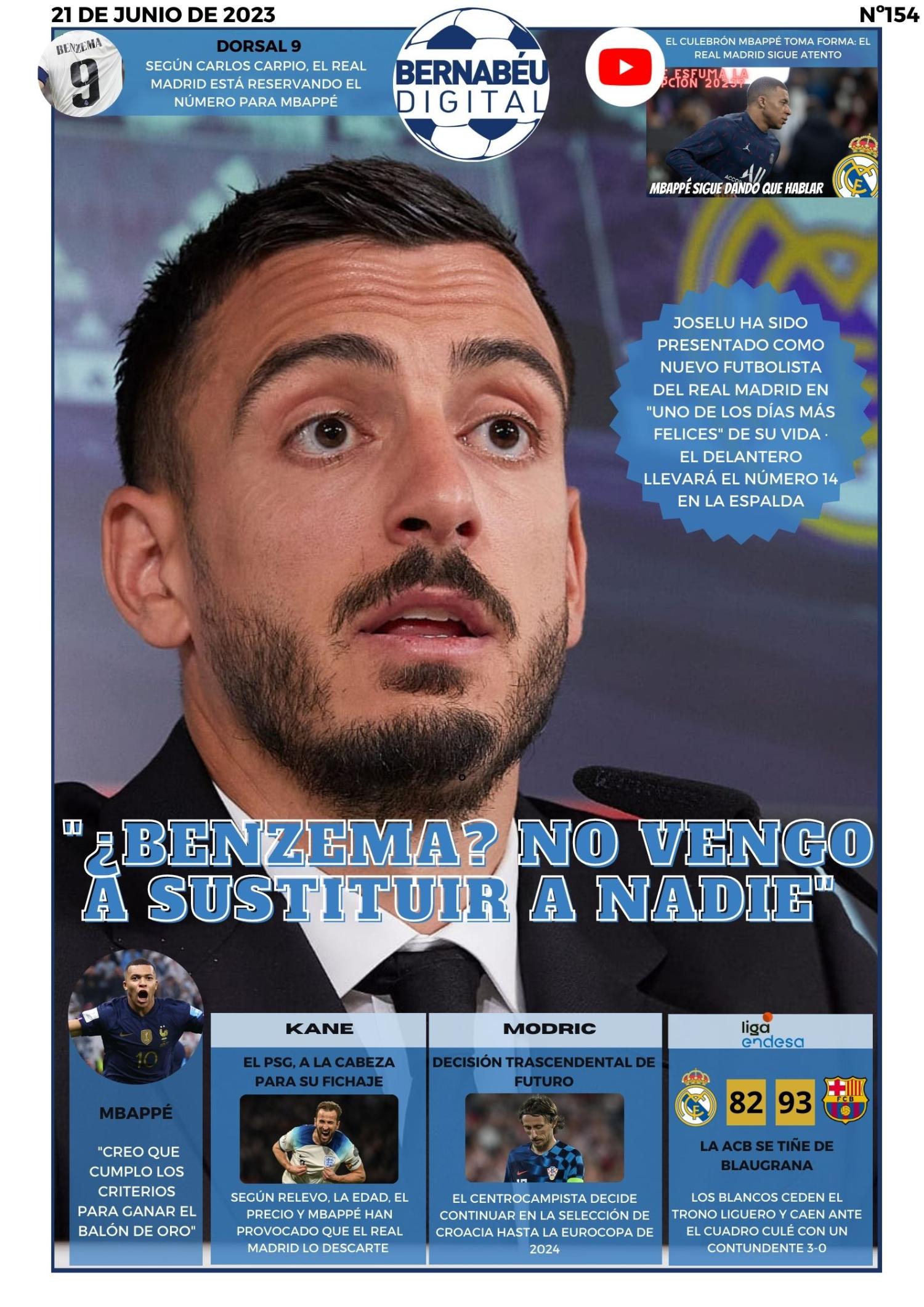 En la portada BD de este miércoles hemos destacado la rueda de prensa de Joselu Mato en su presentación como nuevo futbolista del Real Madrid. Además, destacamos la ausencia de dueño del dorsal 9, las palabras de Mbappé, la decisión de Modric y los motivos del descarte de Harry Kane. También hacemos referencia a la derrota en la Liga Endesa de los de Chus Mateo ante el Barcelona, quien es el nuevo campeón liguero.