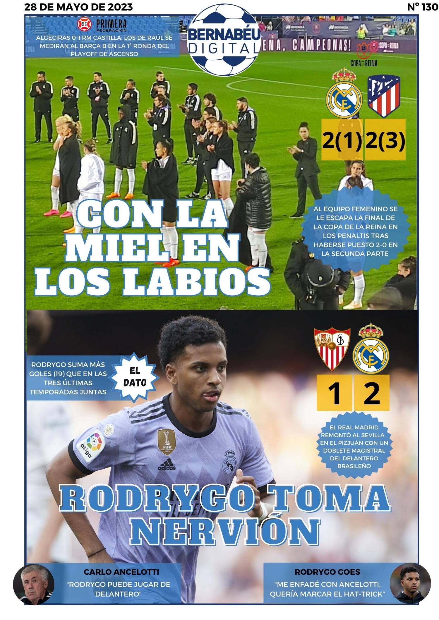 En la portada de Bernabéu Digital para este domingo 28 de mayo destacamos la derrota del Real Madrid Femenino en la final de la Copa de la Reina ante el Atlético, así como la exhibición de Rodrygo contra el Sevilla en Nervión.