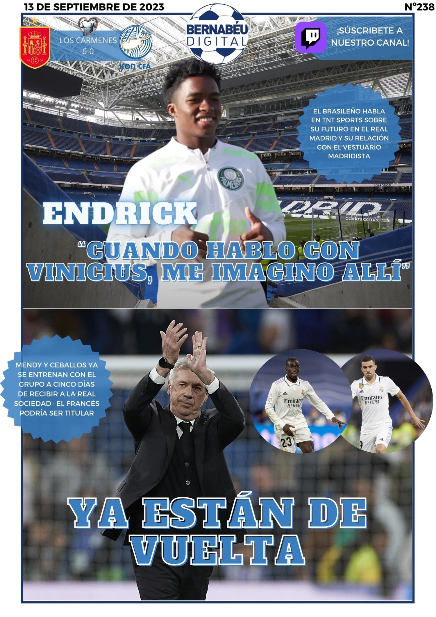En su portada del miércoles 13 de septiembre de 2023, Bernabéu Digital destaca las palabras de Endrick sobre Vinicius, Kylian Mbappé y el Real Madrid. El brasileño se ve capacitado para aterrizar en el Santiago Bernabéu y asegura que ya se imagina vestir de blanco. Además, Ferland Mendy y Dani Ceballos ya están de vuelta con el resto del equipo y podrían entrar por primera vez en la convocatoria ante la Real Sociedad. El francés podría hacerlo desde la titularidad en lugar de Fran García.