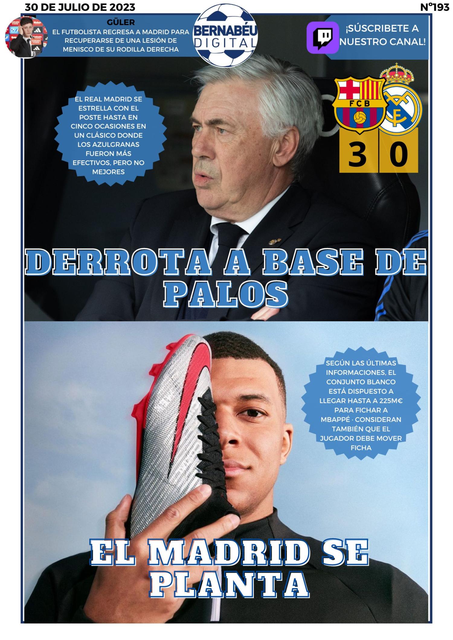 En la portada BD de este domingo destacamos la derrota del Real Madrid en el clásico ante el FC Barcelona por 3-0 y la situación del culebrón Mbappé, donde el conjunto blanco está dispuesto a ofrecer hasta 225M€. Además, comentamos también el retorno de Arda Güler a Madrid para recuperarse de su lesión de menisco que lo tendrá apartado en las próximas semanas.