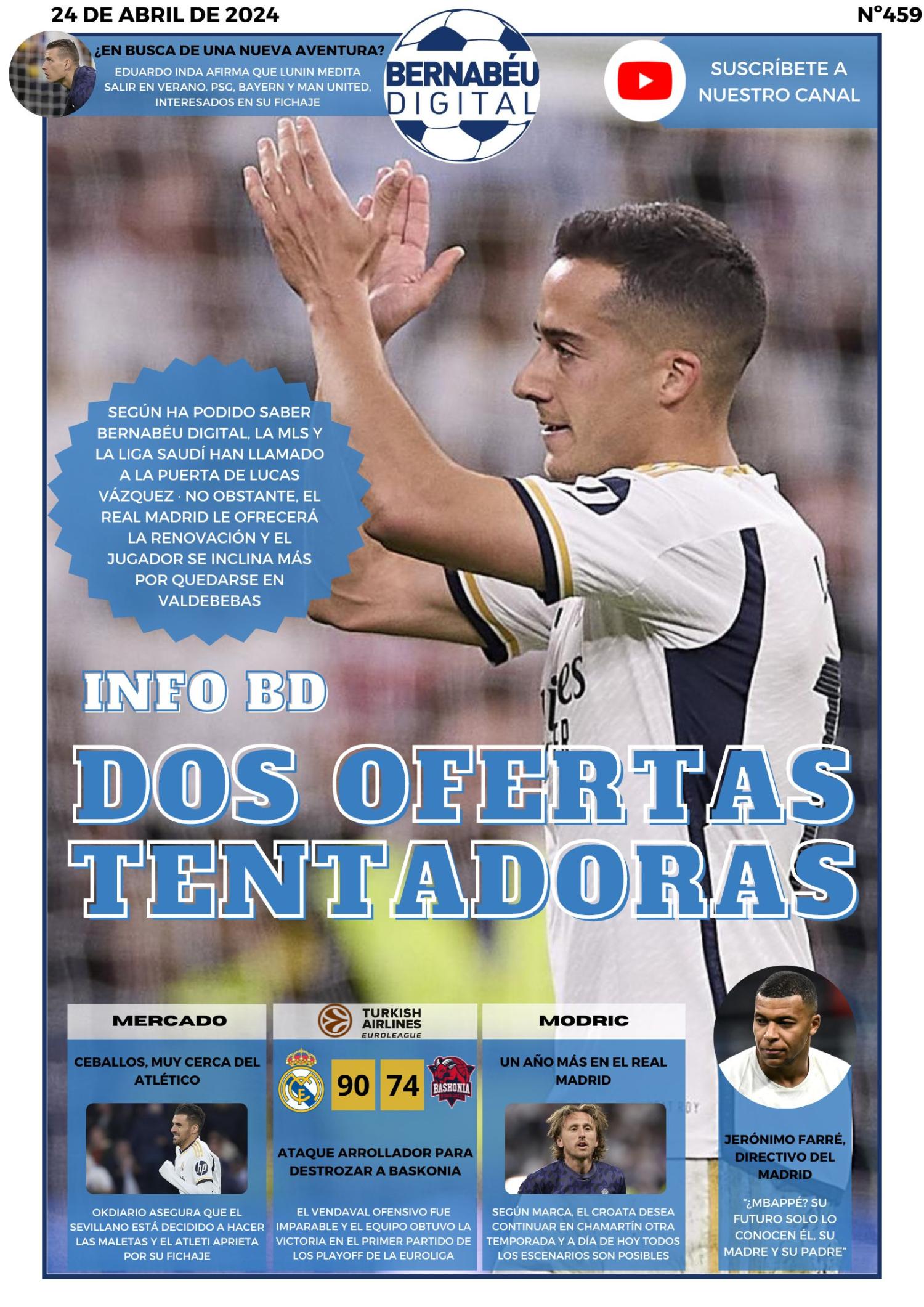 Este miércoles 24 de abril de 2024, en Bernabéu Digital destacamos en portada las dos ofertas que ha recibido Lucas Vázquez para abandonar el Real Madrid, así como otras noticias relevantes como la victoria del equipo de baloncesto ante Baskonia, el interés de varios gigantes europeos en Lunin y la salida inminente de Ceballos al Atlético.