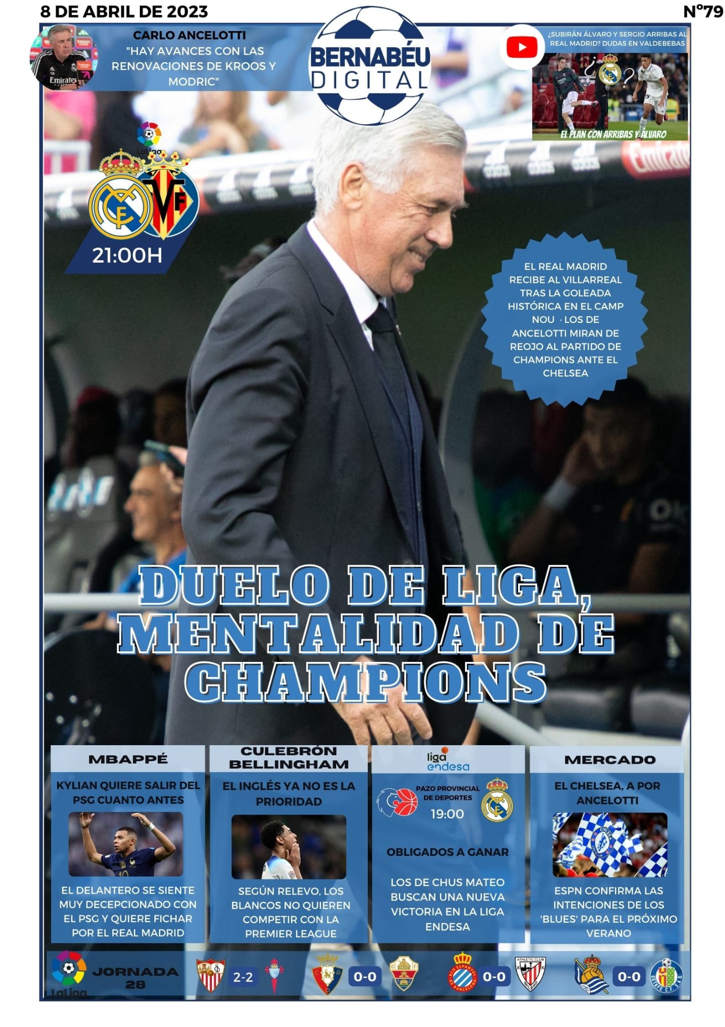 En la portada de Bernabéu Digital de este sábado 8 de abril destacamos el partido de Liga que tiene el Real Madrid ante el Villarreal, aunque los de Ancelotti estará pensando también en el encuentro de Champions del próximo miércoles. Además, contamos las novedades del caso Mbappé, el giro en el fichaje de Bellingham y el nuevo pretendiente que le ha salido a Ancelotti. Este sábado también habrá partido para el equipo de baloncesto.