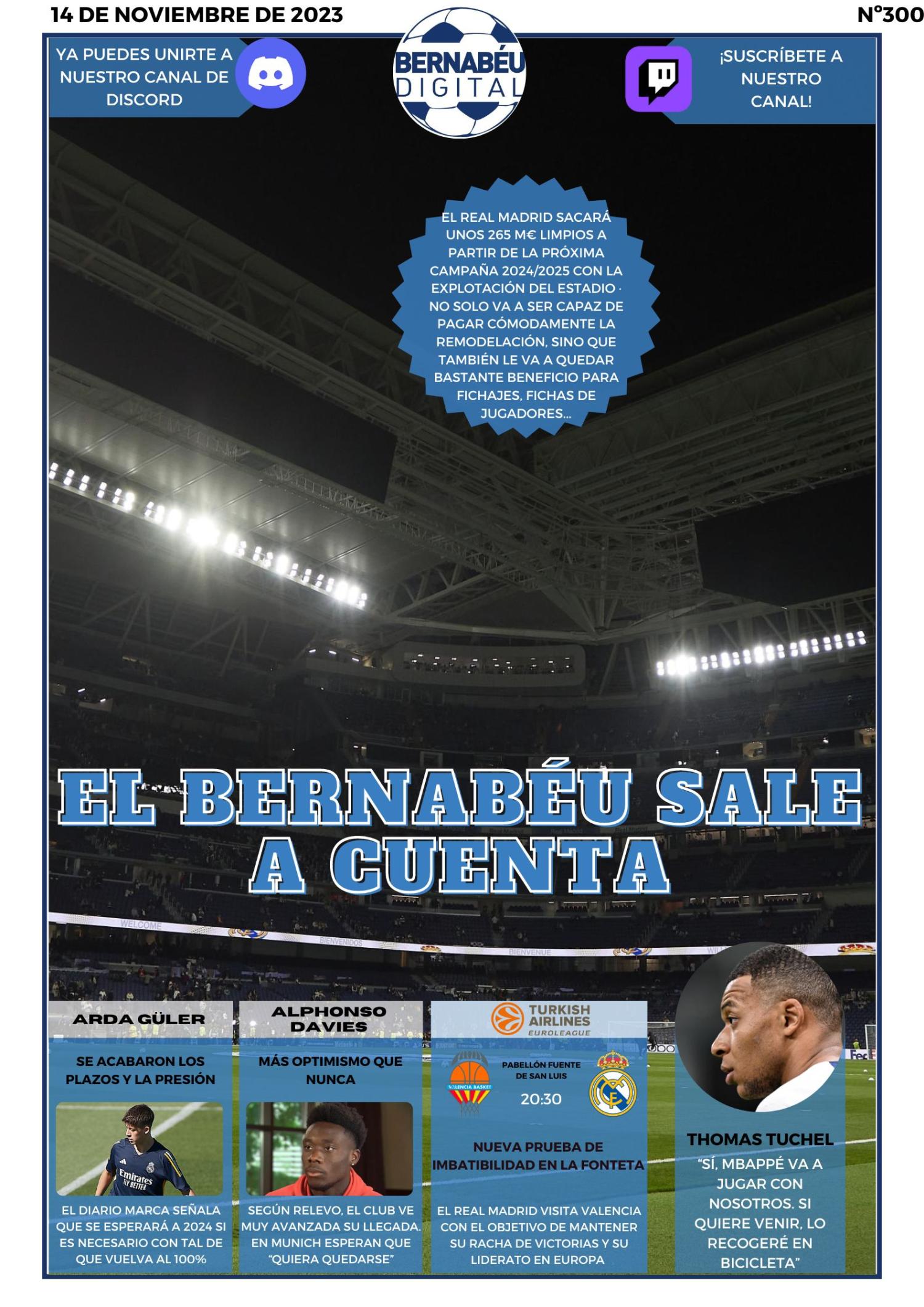 En nuestra edición de este martes 14 de noviembre de 2023, en Bernabéu Digital abrimos con los ingresos del estadio del Real Madrid después de la reforma. Asimismo, destacamos el posible fichaje de Davies, las novedades sobre Arda Güler, la previa de baloncesto y las palabras de Tuchel sobre Mbappé.