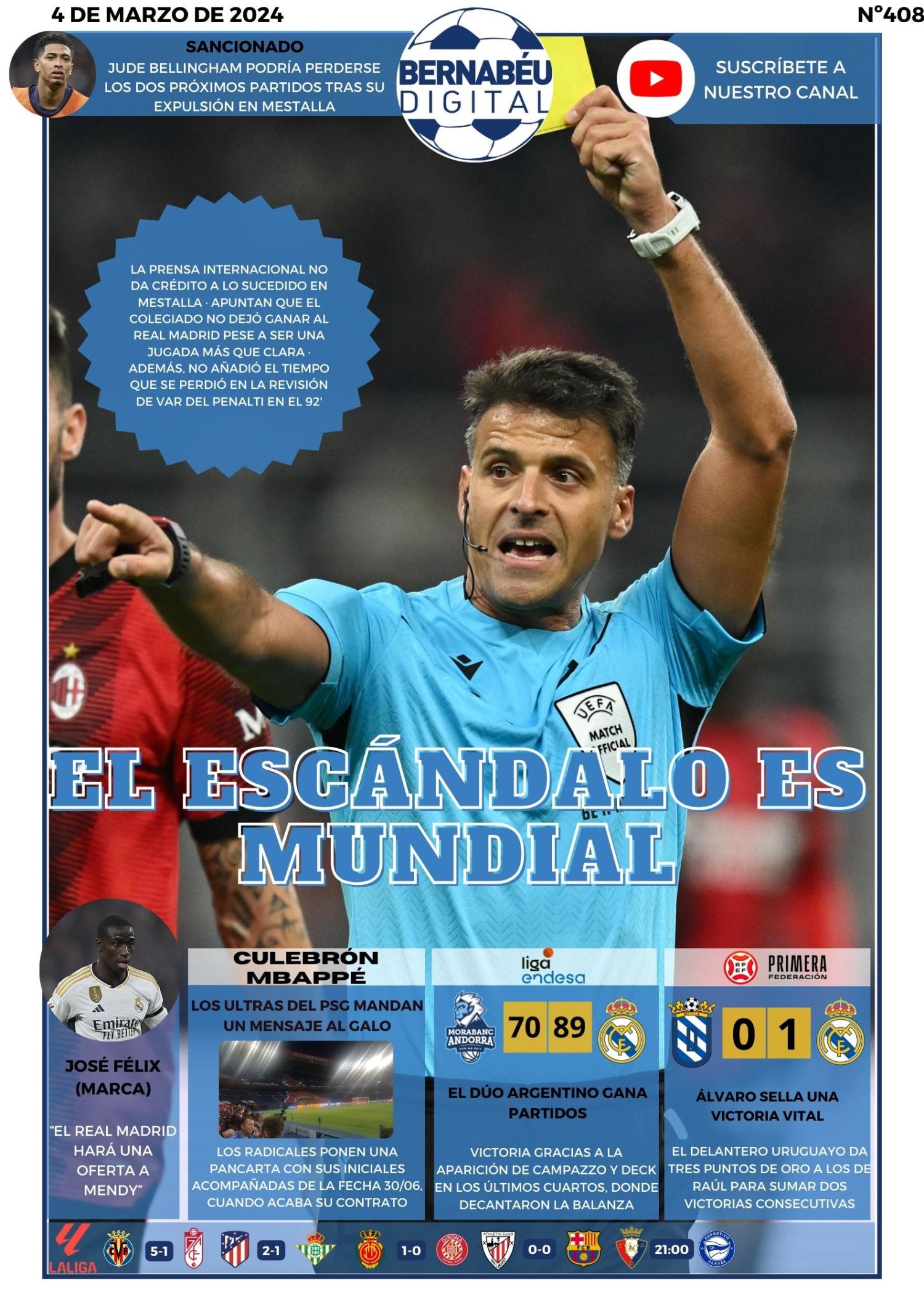 En nuestra portada del lunes 4 de marzo de 2024, en Bernabéu Digital hemos decidido abrir con Gil Manzano y la enorme repercusión que ha tenido a nivel internacional su grosero error al final del Valencia 2-2 Real Madrid. Asimismo, destacamos las victorias en baloncesto y del Castilla, la posible sanción para Jude Bellingham, el mensaje de los ultras del PSG a Mbappé y el futuro de Ferland Mendy.