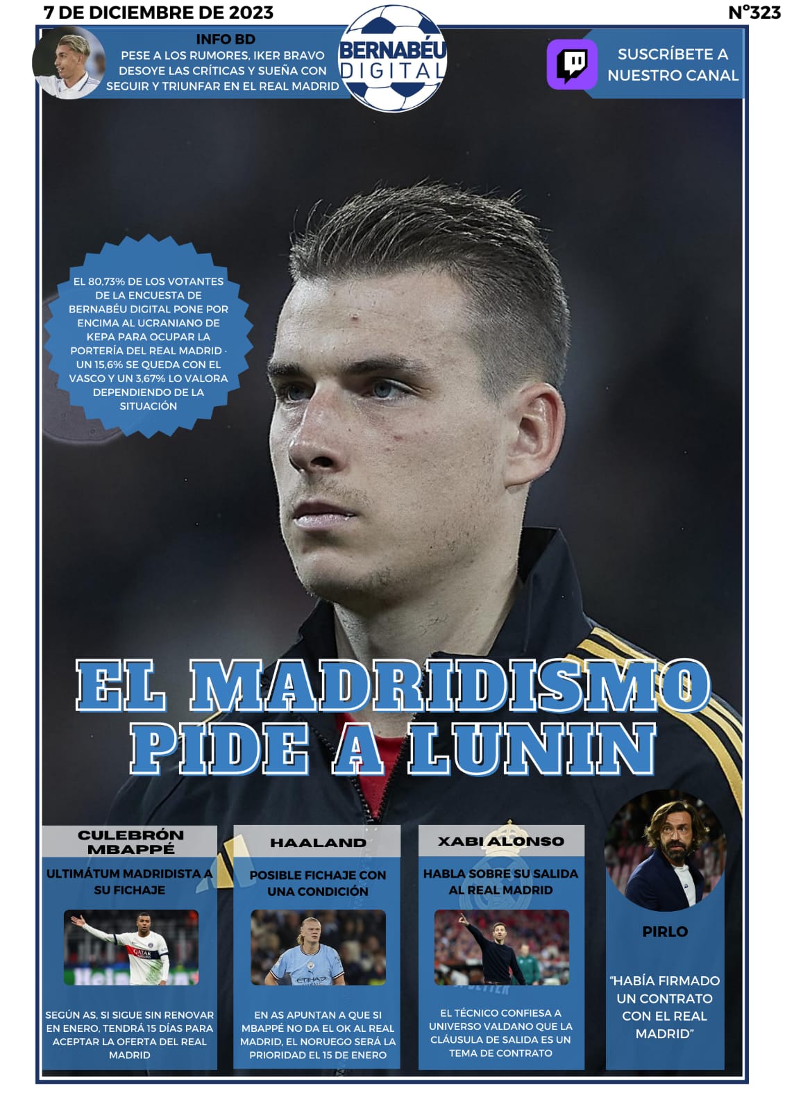 En nuestra portada del jueves 7 de diciembre de 2023, en Bernabéu Digital hemos decidido abrir con los resultados de nuestra encuesta sobre la portería del Real Madrid, la cual ha dejado claro que el madridismo prefiere a Lunin antes que a Kepa. Asimismo, destacamos el ultimátum del club blanco a Mbappé, la opción de Haaland como plan B, nuestra INFO BD sobre Iker Bravo y las declaraciones de Xabi Alonso sobre su futuro.