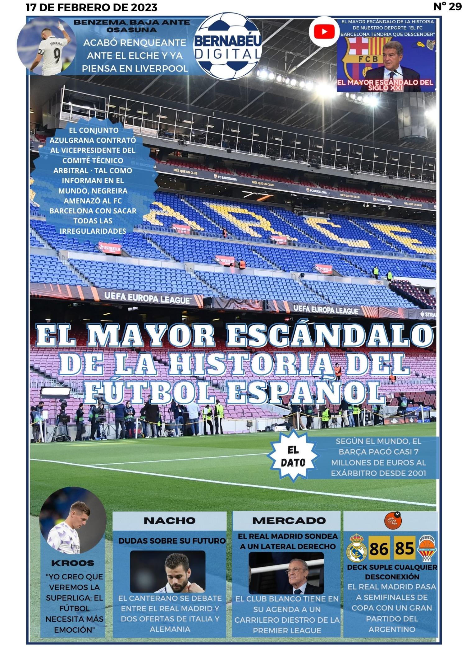 En la portada de este viernes 17 de septiembre, desde Bernabéu Digital hemos querido destacar el pago del FC Barcelona al exvicepresidente del CTA, Enríquez Negreira, en el episodio más escándaloso de la historia del fútbol nacional. También hacemos referencia al futuro de Nacho, las opciones de mercado en la banda derecha y las palabras de Toni Kroos.