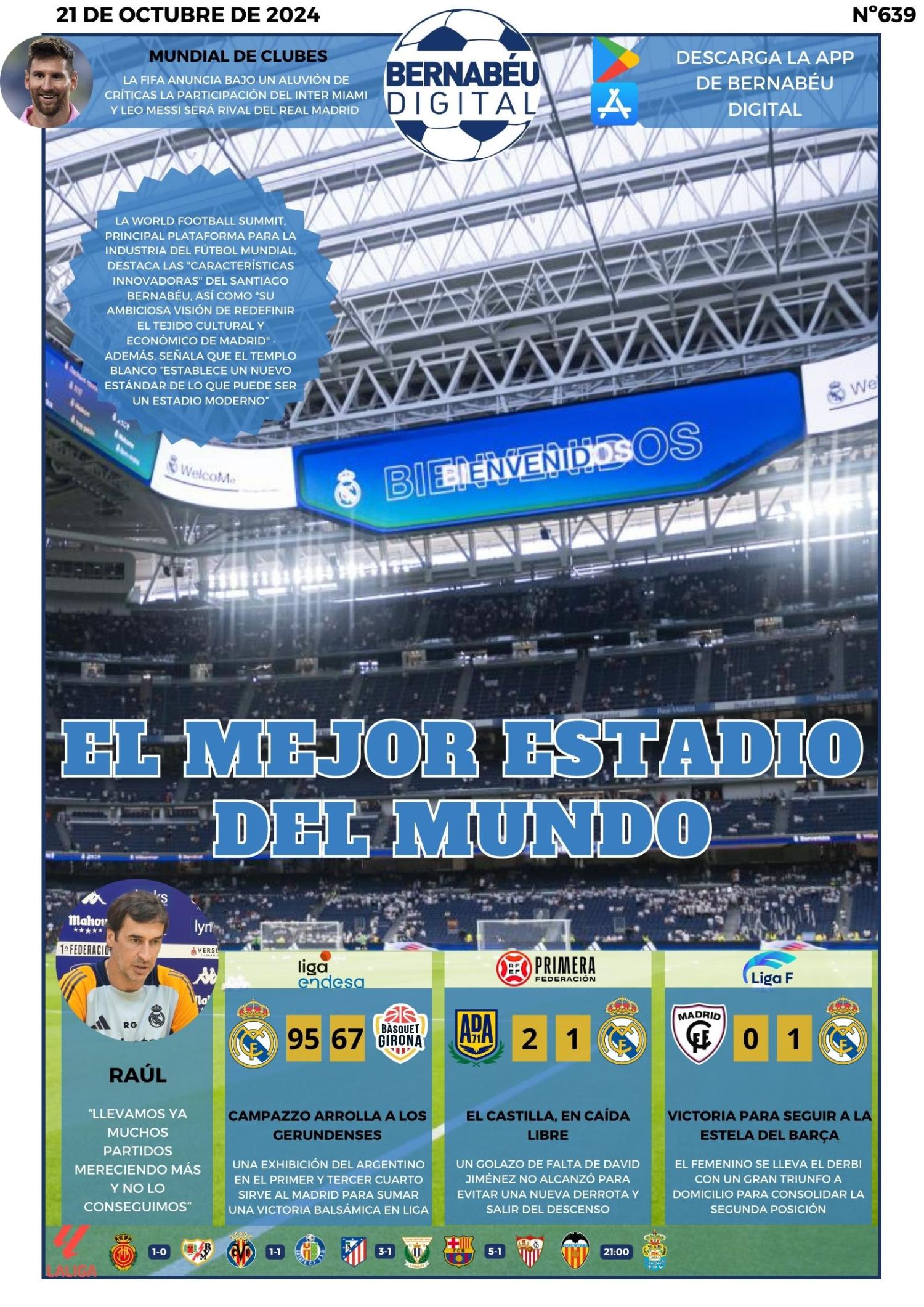 En nuestra portada del lunes 21 de octubre de 2024, en Bernabéu Digital hemos decidido abrir con el estadio del Real Madrid, que ha sido catalogado como el mejor del mundo por la plataforma 'World Football Summit'.