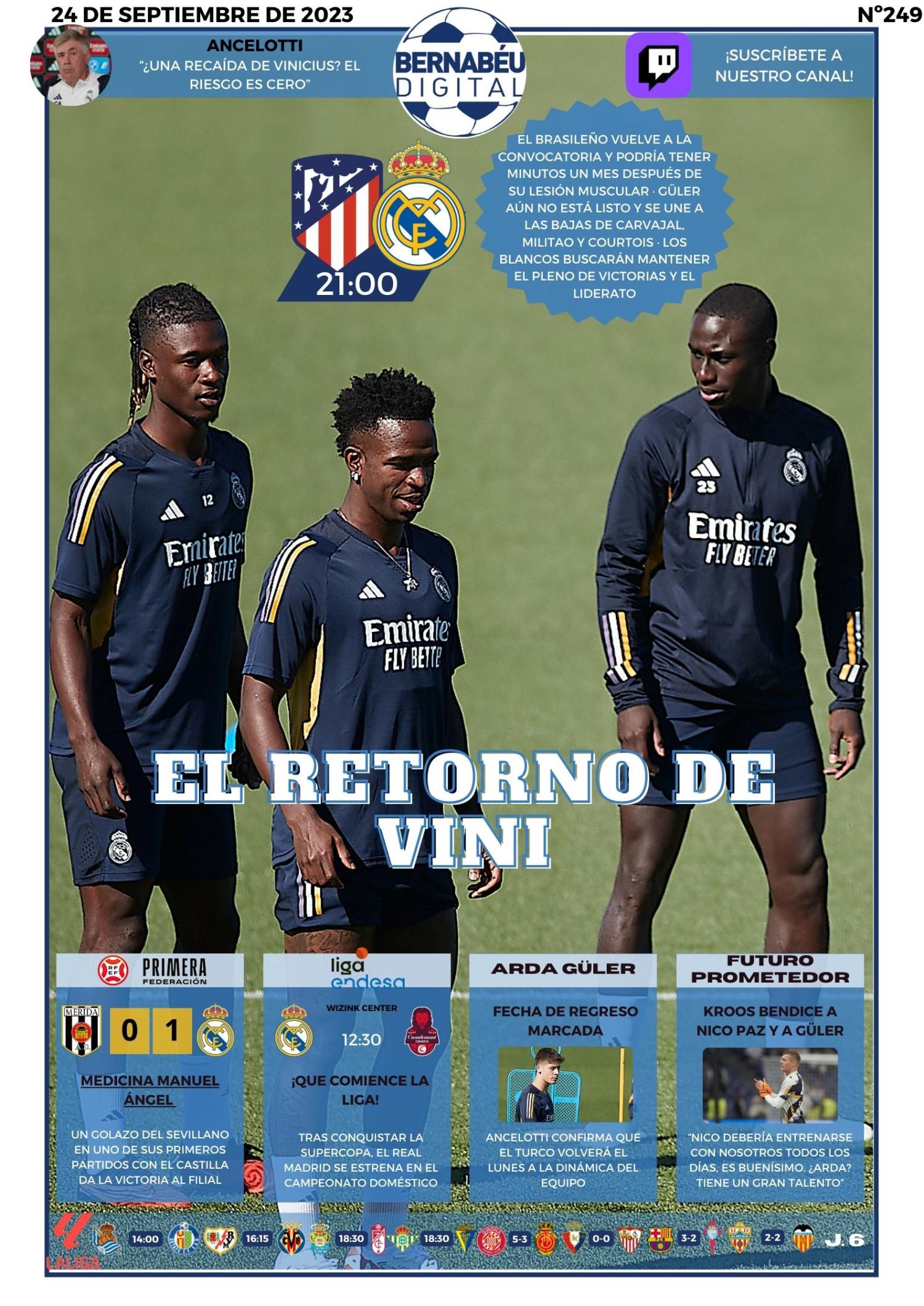 En la portada del día 24 de septiembre de 2023, en Bernabéu Digital abrimos con el regreso de Vinicius a la lista de convocados del Real Madrid para el derbi contra el Atlético de Madrid. Asimismo, destacamos las declaraciones de Carlo Ancelotti, la victoria del Castilla, la previa del baloncesto y la fecha estimada para el regreso de Arda Güler.