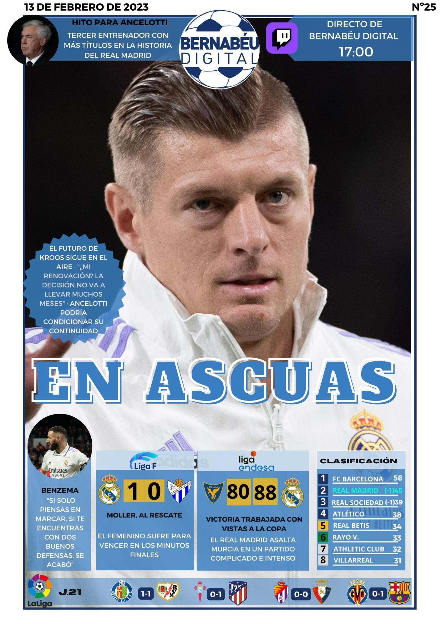 En la portada de Bernabéu Digital de este lunes 13 de febrero hemos querido destacar la situación de la renovación de Toni Kroos con el Real Madrid atendiendo a sus declaraciones y a las últimas informaciones sobre la misma. Además, también destacamos los resultados del resto de secciones del conjunto blanco, las palabras de Benzema y el nuevo hito de Carlo Ancelotti.