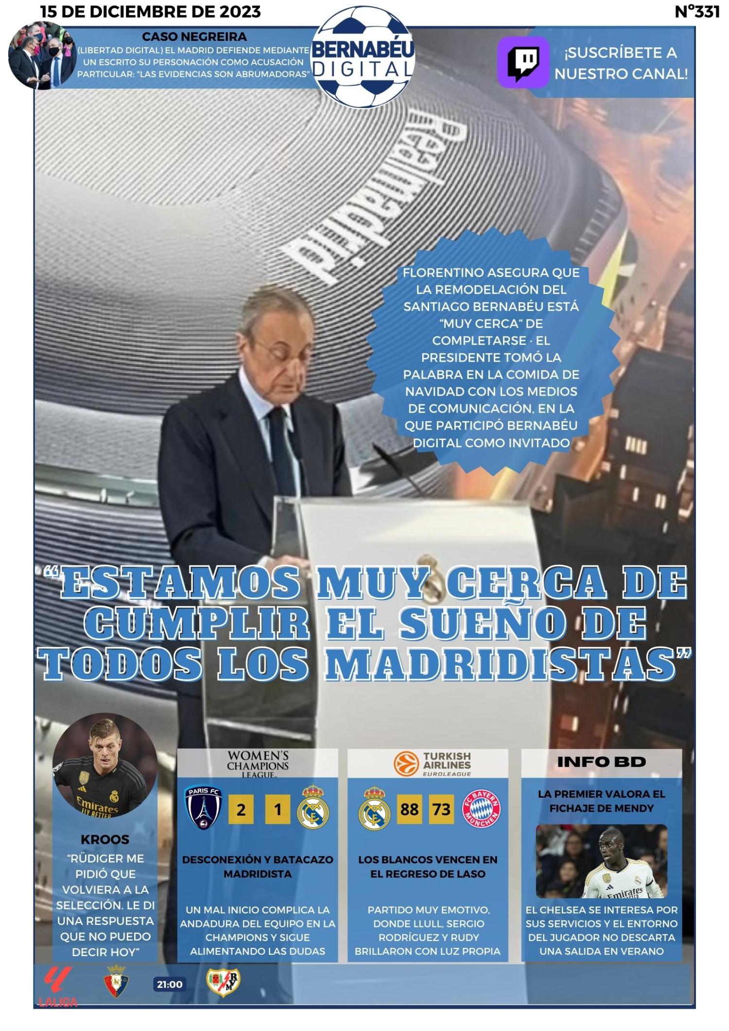 Este viernes 15 de diciembre, en Bernabéu Digital llevamos en portada las declaraciones de Florentino Pérez durante la comida de Navidad con los medios de comunicación, la derrota del Real Madrid femenino ante el Paris FC, la victoria del equipo de baloncesto contra el Bayern, la última INFO BD sobre Mendy, y las últimas novedades sobre el caso Negreira.
