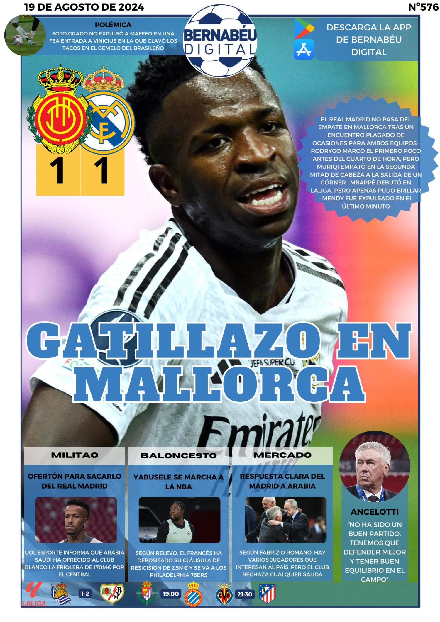 En la portada BD de este lunes hemos destacado el partido del Real Madrid frente al RCD Mallorca y las declaraciones de Carlo Ancelotti. También hablamos de la última hora acerca de la posible salida de Militao a Arabia Saudí y la ya confirmada de Yabusele a la NBA.