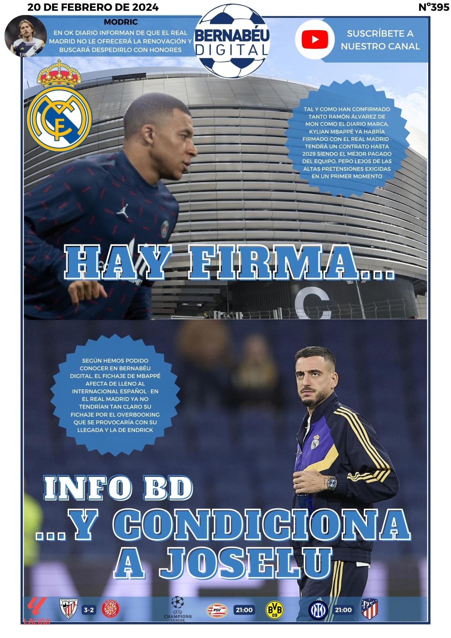 En la portada BD de este martes destacamos la firma de Mbappé con el Real Madrid y la última INFO BD sobre Joselu. También hacemos referencia al futuro de Modric.