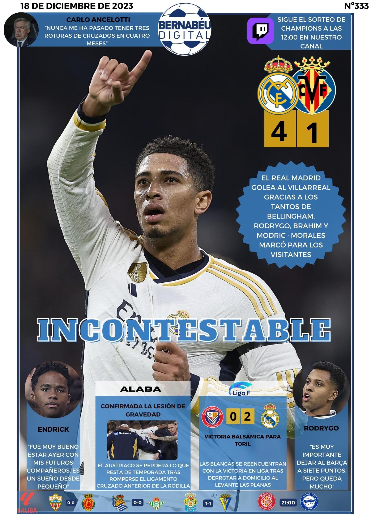 En la portada BD de este lunes destacamos la goleada del Real Madrid ante el Villarreal. Un partido en el que se confirmó la lesión para lo que resta de temporada de David Alaba. También hacemos referencia a las palabras de Endrick, Ancelotti y Rodrygo y la victoria del femenino.