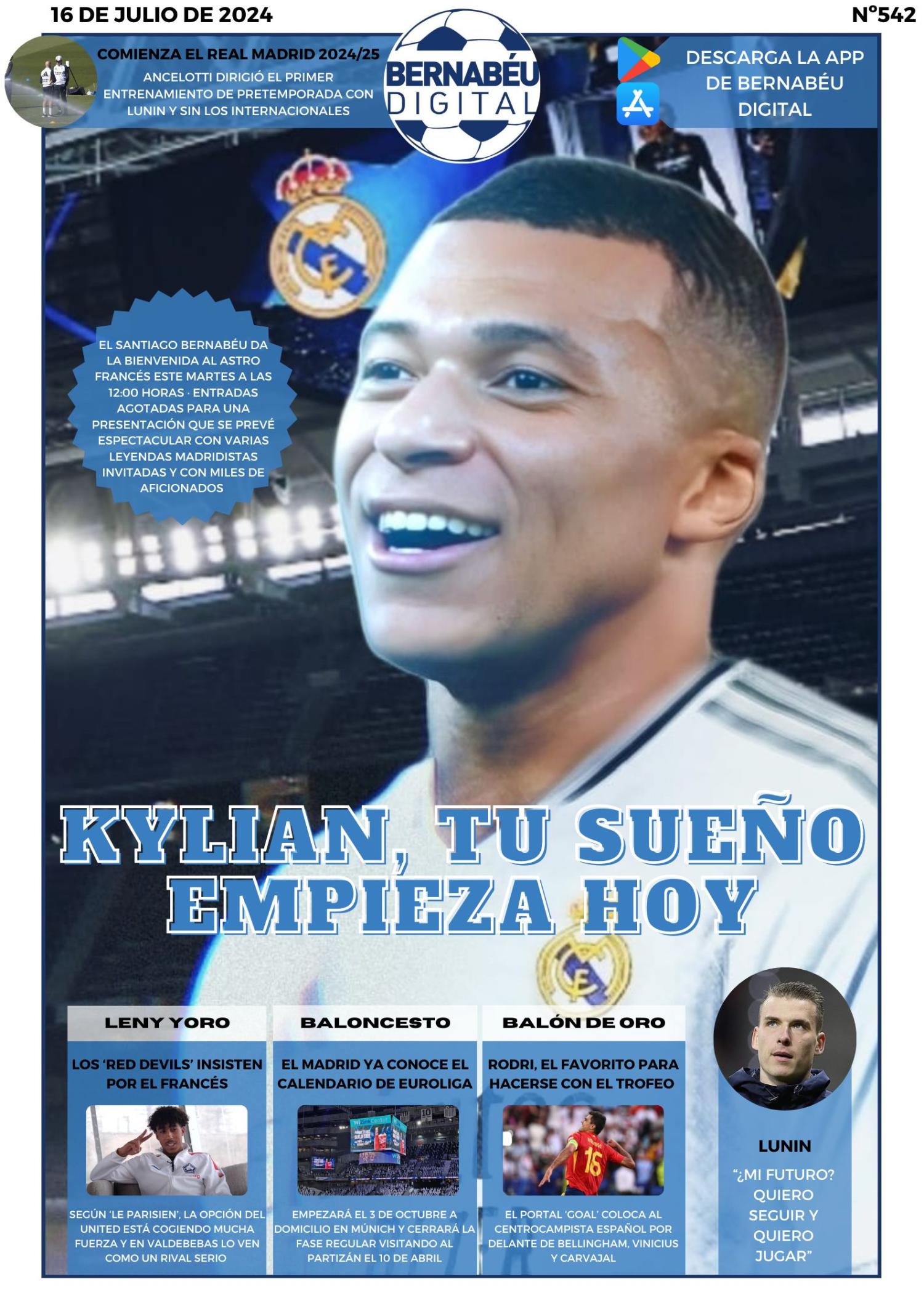 En la portada BD de este martes destacamos la presentación de Kylian Mbappé con el Real Madrid, la cual será este 16 de julio. Además, hacemos referencia a las últimas novedades con Leny Yoro, el calendario de Euroliga, las palabras de Lunin sobre su futuro, el favoritismo de Rodri para el Balón de Oro según OPTA, y el primer entrenamiento del curso.
